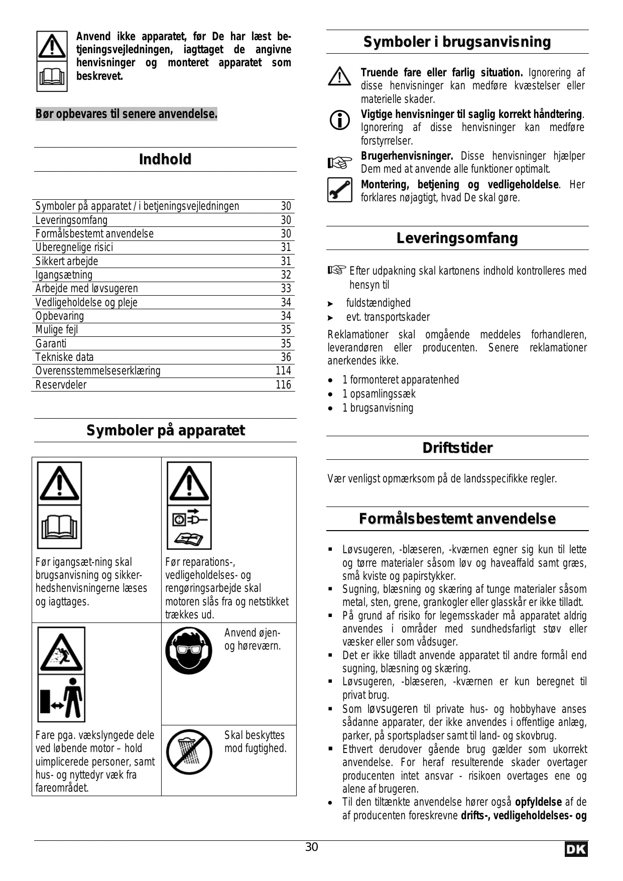 - 1 brugsanvisning Symboler på apparatet Driftstider Vær venligst opmærksom på de landsspecifikke regler. Formålsbestemt anvendelse Før igangsæt-ning skal brugsanvisning og sikkerhedshenvisningerne læses og iagttages. Løvsugeren, -blæseren, -kværnen egner sig kun til lette og tørre materialer såsom løv og haveaffald samt græs, små kviste og papirstykker. Sugning, blæsning og skæring af tunge materialer såsom metal, sten, grene, grankogler eller glasskår er ikke tilladt. På grund af risiko for legemsskader må apparatet aldrig anvendes i områder med sundhedsfarligt støv eller væsker eller som vådsuger. Det er ikke tilladt anvende apparatet til andre formål end sugning, blæsning og skæring. Løvsugeren, -blæseren, -kværnen er kun beregnet til privat brug. Som løvsugeren til private hus- og hobbyhave anses sådanne apparater, der ikke anvendes i offentlige anlæg, parker, på sportspladser samt til land- og skovbrug. Ethvert derudover gående brug gælder som ukorrekt anvendelse. For heraf resulterende skader overtager producenten intet ansvar - risikoen overtages ene og alene af brugeren.