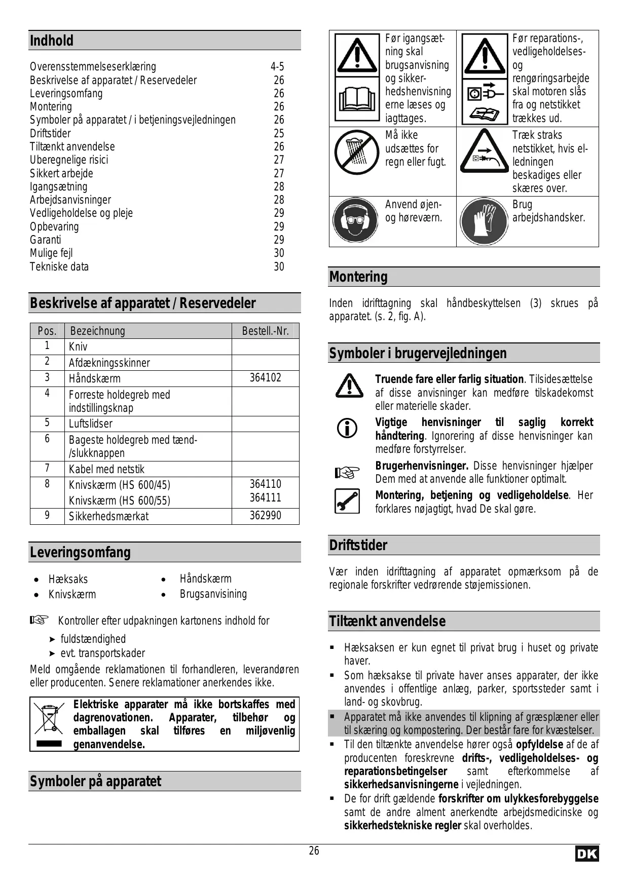 Indhold Overensstemmelseserklæring Beskrivelse af apparatet / Reservedeler Leveringsomfang Montering Symboler på apparatet / i betjeningsvejledningen Driftstider Tiltænkt anvendelse Uberegnelige risici Sikkert arbejde Igangsætning Arbejdsanvisninger Vedligeholdelse og pleje Opbevaring Garanti Mulige fejl Tekniske data