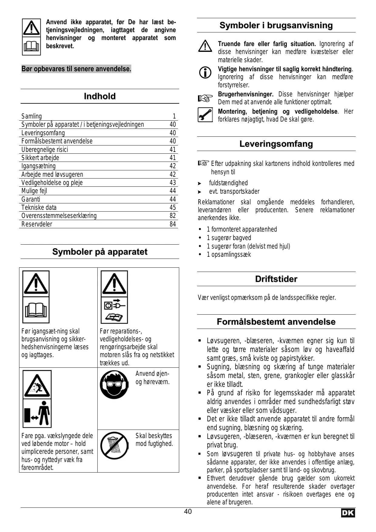 Indhol Brugerhenvisninger. Disse henvisninger hjælper dhold Dem med at anvende alle funktioner optimalt. Sam 1 Montering, betjening og vedligeholdelse. Her aming —— = forklares ngjagtigt, hvad De skal ggre. Symboler pà apparatet / i betjeningsvejledningen 40 Leveringsomfang 40 Formälsbestemt anvendelse 40 L î verin mfan Uberegnelige risici 41 everingsomfang Sikkert arbejde 41 : Igangsætning 42 LT Efter udpakning skal kartonens indhold kontrolleres med Arbejde med lavsugeren 42 hensyn til Vedligeholdelse og pleje 43 >. fuldstændighed Mulige fejl 44 >. evt transportskader Garanti 44 Reklamationer skal omgäende meddeles forhandleren, Tekniske data _ 45 leverandgren eller producenten. Senere reklamationer Overensstemmelseserklæring 82 anerkendes ikke. Reservdeler 84 +1 formonteret apparatenhed +1 sugergr bagved +1 sugerpr foran (delvist med hjul) Symboler pà apparatet + Lopsamingssæk À VAN Driftstider rs Vær venligst opmærksom pà de landsspecifikke regler. [ ] [O]D- 29 Formälsbestemt anvendelse Far igangsæt-ning skal For reparations.,