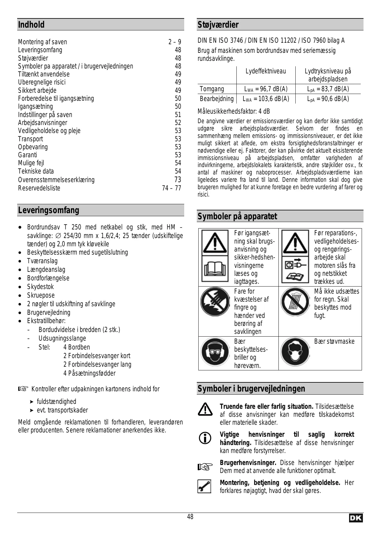 Indhold Montering af saven Leveringsomfang Støjværdier Symboler pa apparatet / i brugervejledningen Tiltænkt anvendelse Uberegnelige risici Sikkert arbejde Forberedelse til igangsætning Igangsætning Indstillinger på saven Arbejdsanvisninger Vedligeholdelse og pleje Transport Opbevaring Garanti Mulige fejl Tekniske data Overensstemmelseserklæring Reservedelsliste