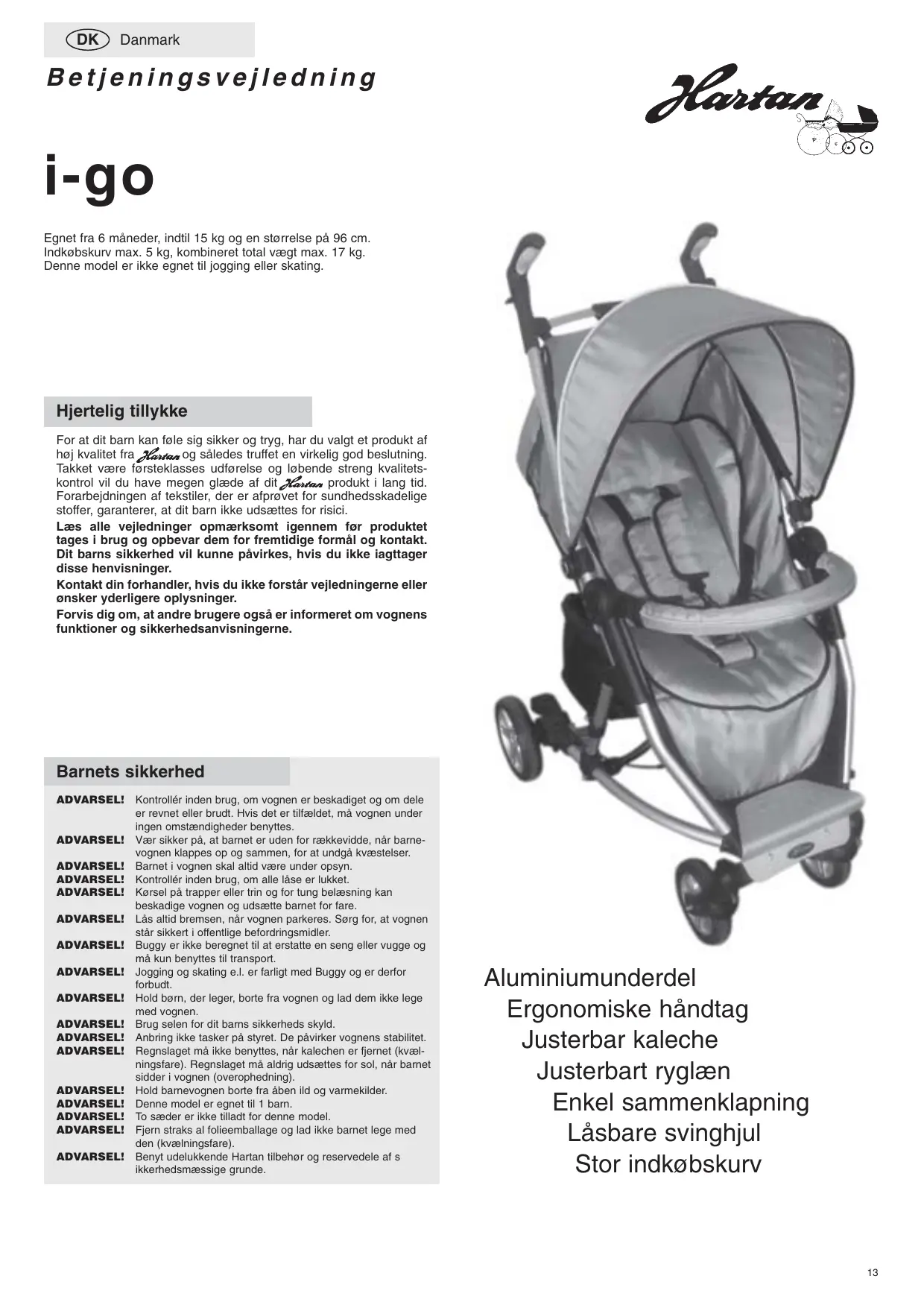 Danmark Betjeningsvejledning i-go Egnet fra 6 måneder, indtil 15 kg og en størrelse på 96 cm. Indkøbskurv max. 5 kg, kombineret total vægt max. 17 kg. Denne model er ikke egnet til jogging eller skating. Hjertelig tillykke For at dit barn kan føle sig sikker og tryg, har du valgt et produkt af høj kvalitet fra og således truffet en virkelig god beslutning. Takket være førsteklasses udførelse og løbende streng kvalitetskontrol vil du have megen glæde af dit produkt i lang tid. Forarbejdningen af tekstiler, der er afprøvet for sundhedsskadelige stoffer, garanterer, at dit barn ikke udsættes for risici. Læs alle vejledninger opmærksomt igennem før produktet tages i brug og opbevar dem for fremtidige formål og kontakt. Dit barns sikkerhed vil kunne påvirkes, hvis du ikke iagttager disse henvisninger. Kontakt din forhandler, hvis du ikke forstår vejledningerne eller ønsker yderligere oplysninger. Forvis dig om, at andre brugere også er informeret om vognens funktioner og sikkerhedsanvisningerne. Barnets sikkerhed ADVARSEL! ADVARSEL! ADVARSEL! ADVARSEL! ADVARSEL! ADVARSEL! ADVARSEL! ADVARSEL! ADVARSEL! ADVARSEL! ADVARSEL! ADVARSEL! ADVARSEL! ADVARSEL! ADVARSEL! ADVARSEL! ADVARSEL! Kontrollér inden brug, om vognen er beskadiget og om dele er revnet eller brudt. Hvis det er tilfældet, må vognen under ingen omstændigheder benyttes. Vær sikker på, at barnet er uden for rækkevidde, når barnevognen klappes op og sammen, for at undgå kvæstelser. Barnet i vognen skal altid være under opsyn. Kontrollér inden brug, om alle låse er lukket. Kørsel på trapper eller trin og for tung belæsning kan beskadige vognen og udsætte barnet for fare. Lås altid bremsen, når vognen parkeres. Sørg for, at vognen står sikkert i offentlige befordringsmidler. Buggy er ikke beregnet til at erstatte en seng eller vugge og må kun benyttes til transport. Jogging og skating e.l. er farligt med Buggy og er derfor forbudt. Hold børn, der leger, borte fra vognen og lad dem ikke lege med vognen. Brug selen for dit barns sikkerheds skyld. Anbring ikke tasker på styret. De påvirker vognens stabilitet. Regnslaget må ikke benyttes, når kalechen er fjernet (kvælningsfare). Regnslaget må aldrig udsættes for sol, når barnet sidder i vognen (overophedning). Hold barnevognen borte fra åben ild og varmekilder. Denne model er egnet til 1 barn. To sæder er ikke tilladt for denne model. Fjern straks al folieemballage og lad ikke barnet lege med den (kvælningsfare). Benyt udelukkende Hartan tilbehør og reservedele af s ikkerhedsmæssige grunde. Aluminiumunderdel Ergonomiske håndtag Justerbar kaleche Justerbart ryglæn Enkel sammenklapning Låsbare svinghjul Stor indkøbskurv