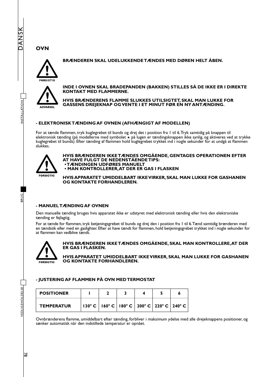 200° C 220° C 240° C Ovnbrænderens flamme, umiddelbart efter tænding, forbliver i maksimum ydelse med alle drejeknappens positioner, og sænker automatisk når den indstillede temperatur er opnået.