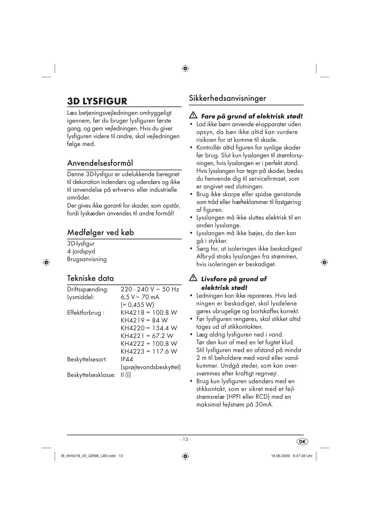 Læs betjeningsveiledningen omhyggeligt igennem, fer du bruger lysfiguren farste gang, og gem veiledningen. Hvis du giver lysfiguren videre til andre, skal veiledningen folge med. Anvendelsesformäl Denne 3Dysfigur er udelukkende beregnet til dekoration indendars og udendars og ikke til anvendelse pä erhvervs- eller industrielle omräder. Der gives ikke garanti for skader, som opstär, fordi lyskæden anvendes til andre formäll! Medfolger ved kab 3Dysfigur 4 jordspyd Brugsanvisning Tekniske data Driftsspænding: 220-240 V - 50 Hz Lysmiddel: 6,5V- 70 mA (= 0,455 W) Effektforbrug : KH4218 = 100.8 W KH4219=84W KH4220 = 1344 W KH4221=-672W KH4222 = 100.8 W KH4223 =1176W Beskyttelsesart: IP44 (sprajtevandsbeskyttet) Beskyttelsesklasse: 11 Sikkerhedsanvisninger A Fare pà grund af elektrisk stod! + _Lad ikke bgrn anvende el-apparater uden opsyn, da ban ikke altid kan vurdere risikoen for at komme til skade. Kontrollér altid figuren for synlige skader fer brug. Slut kun lysslangen til stremforsy- ningen, hvis lysslangen er i perfekt stand. Hvis lysslangen har tegn pä skader, bedes du henvende dig til servicefirmaet, som er angivet ved sluiningen. + Brug ikke skarpe eller spidse genstande som träd eller hæfteklammer til fastgaring af figuren. + _Lysslangen mà ikke sluttes elektrisk til en anden lysslange. + _Lysslangen mä ikke bgjes, da den kan gä i stykker. + Sarg for, at isoleringen ikke beskadiges! Afbryd straks lysslangen fra strämmen, hvis isoleringen er beskadiget. À Livsfare pâ grund af elektrisk stod! +_Ledningen kan ikke repareres. Hvis led- ningen er beskadiget, skal lysdelene gares ubrugelige og boriskatfes korrekt. For lysfiguren rengares, skal stikket altid tages ud af stikkontakten. Læg aldrig lysfiguren ned i vand. Ter den kun af med en let fugtet klud. Stil lysfiguren med en afstand pä mindst 2 mtil beholdere med vand eller vand- kummer. Undgä steder, som kan over- svammes efter kraftigt regnveir. Brug kun lysfiguren udendars med en stikkontakt, som er sikret med et feil- strgmsrelæ (HPFI eller RCD) med en maksimal feilstrom pà 30mA. IB_KH4218_28 82008 LB3.indd 13 18062000 s47seun |