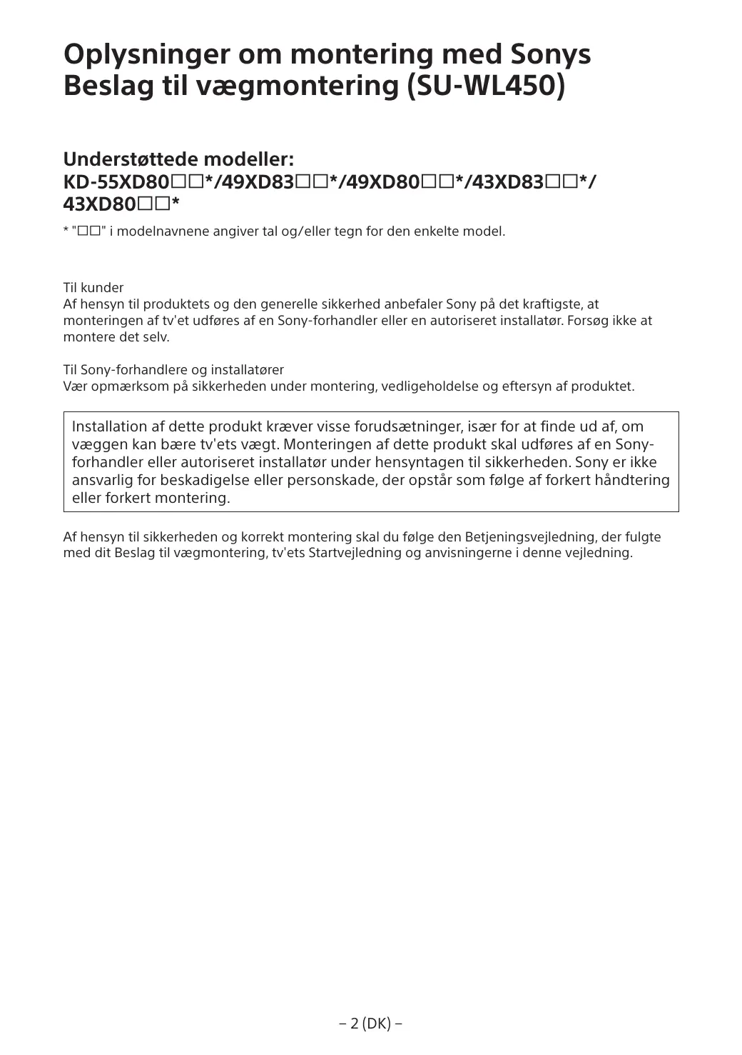 Oplysninger om montering med Sonys Beslag til vægmontering (SU-WL450) Understøttede modeller: KD-55XD80*/49XD83*/49XD80*/43XD83*/ 43XD80* * "" i modelnavnene angiver tal og/eller tegn for den enkelte model.