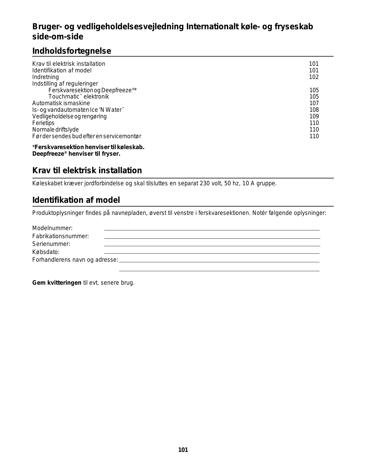 *Ferskvaresektion henviser til køleskab. Deepfreeze® henviser til fryser. Krav til elektrisk installation Køleskabet kræver jordforbindelse og skal tilsluttes en separat 230 volt, 50 hz, 10 A gruppe. Identifikation af model Produktoplysninger findes på navnepladen, øverst til venstre i ferskvaresektionen. Notér følgende oplysninger: Modelnummer: Fabrikationsnummer: Serienummer: Købsdato: Forhandlerens navn og adresse: Gem kvitteringen til evt. senere brug.