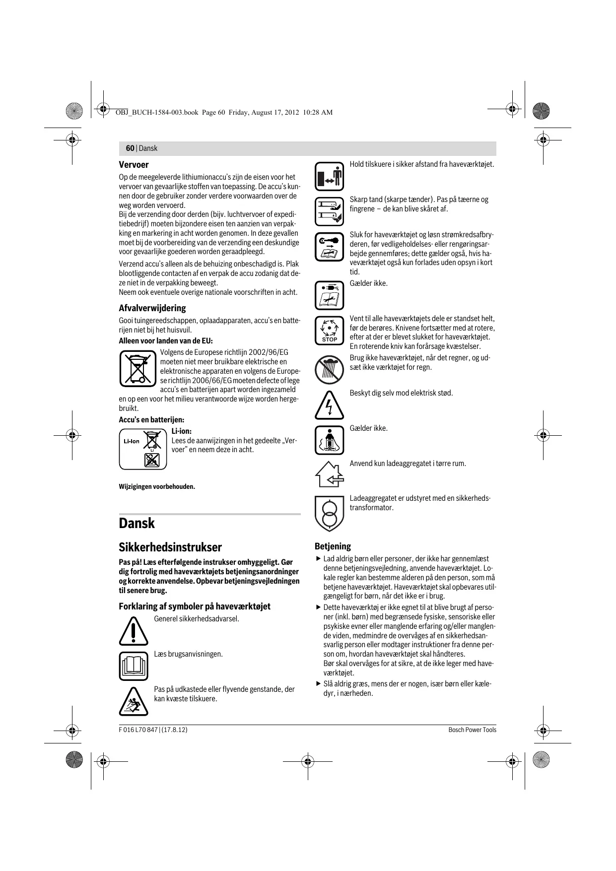f Ladeaggregatet må ikke udsættes for regn eller fugtighed. Indtrængning af vand i ladeaggregatet øger risikoen for elektrisk stød. f Oplad kun akku’er i ladeaggregater, der er anbefalet af fabrikanten. Et ladeaggregat, der er egnet til en bestemt type batterier, må ikke benyttes med andre batterier – brandfare. f Lad ikke fremmede akkuer. Ladeaggregatet er kun beregnet til ladning af Bosch Li-ion-akkuer med de spændinger, der er angivet i de tekniske data. Ellers er der fare for brand og eksplosion. f Renhold ladeaggregatet. Snavs øger faren for elektrisk stød. f Kontrollér ladeaggregat, kabel og stik før brug. Anvend ikke ladeaggregatet, hvis det er beskadiget. Forsøg ikke at åbne ladeaggregatet og sørg for at det repareres af kvalificerede fagfolk, og at der kun benyttes originale reservedele. Beskadigede ladeaggregater, kabler og stik øger risikoen for elektrisk stød. f Anvend ikke ladeaggregatet på let brændbar undergrund (f.eks. papir, tekstiler osv.) eller i brændbare omgivelser. Pas på! Ladeaggregatet bliver varmt under opladningen. Brandfare! f Brug kun Bosch akkuerne, der er beregnet til dette haveværktøj. Brug af andre akkuer kan føre til kvæstelser og er forbundet med brandfare. f Ikke benyttede akku’er må ikke komme i berøring med kontorclips, mønter, nøgler, søm, skruer eller andre små metalgenstande, da disse kan kortslutte kontakterne. En kortslutning mellem akku-kontakterne øger risikoen for personskader i form af forbrændinger. F 016 L70 847 | (17.8.12) OBJ_BUCH-1584-003.book Page 62 Friday, August 17, 2012 10:28 AM 62 | Dansk f Hvis akku’en anvendes forkert, kan der slippe væske ud af akku’en. Undgå at komme i kontakt med denne væske. Hvis det alligevel skulle ske, skylles med vand. Søg læge, hvis væsken kommer i øjnene. Akku-væske kan give hudirritation eller forbrændinger. f Åben ikke akkuen. Fare for kortslutning. f Beskyt akkuen mod varme (f.eks. også mod varige solstråler, brand, vand og fugtighed). Fare for eksplosion. f Kortslut ikke akkuen. Fare for eksplosion. f Beskadiges akkuen eller bruges den forkert, kan der sive dampe ud. Tilfør frisk luft og søg læge, hvis du føler dig utilpas. Dampene kan irritere luftvejene. f Beskyt akkuen mod fugtighed og vand. f Opbevar kun akkuen i et temperaturområde mellem 0 °C og 50 °C. Opbevar ikke akkuen i bilen f.eks. om sommeren. f Rengør akkuens ventilationsåbninger en gang imellem med en blød, ren og tør pensel. Symbol Bevægelsesretning Brug beskyttelseshandsker Vægt Start Stop Tilladt handling Forbudt handling Symboler De efterfølgende symboler er af betydning for at kunne læse og forstå brugsanvisningen. Læg mærke til symbolerne og overhold deres betydning. En rigtig forståelse af symbolerne er med til at sikre en god og sikker brug af haveværktøjet. Betydning Reaktionsretning Tilbehør/reservedele Beregnet anvendelse Haveværktøjet er beregnet til græsslåning i private haver. Tekniske data Akku-plæneklipper Typenummer Knivbredde Slåhøjde Volumen, græsboks Vægt svarer til EPTA-Procedure 01/2003 Serienummer Akku Typenummer Nominel spænding Kapacitet Ladetid (tom akku)** Antal akkuceller Ladeaggregat Typenummer Ladestrøm Tilladt temperaturområde for opladning Vægt svarer til EPTA-Procedure 01/2003 Beskyttelsesklasse **med ladeaggregat AL 3620 CV Professional