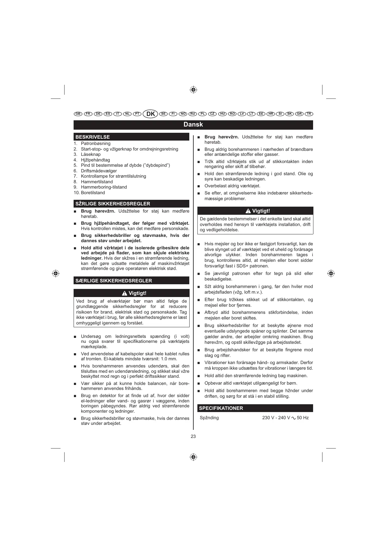 2. Gâchette et sélecteur du sens de rotation 3. Bouton de verrouillage 4. Poignée auxiliaire 5. Butée de Profondeur 6. Sélecteur de mode 7. Témoin de mise sous tension 8. Mode percussion 9. Mode perçage avec burinage 10. Mode perçage Assurez-vous que la tension (en volts) utilisée correspond aux indications figurant sur la plaque signalétique de l'outil.