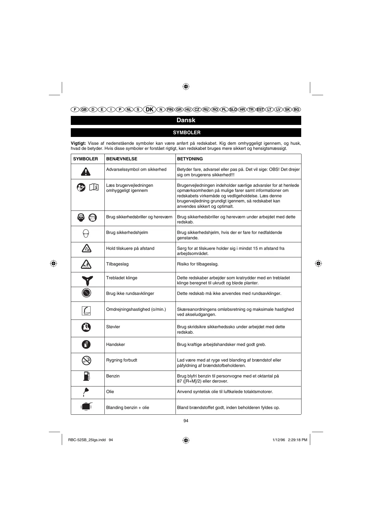 Dansk SYMBOLER Vigtigt: Visse af nedenstående symboler kan være anført på redskabet. Kig dem omhyggeligt igennem, og husk, hvad de betyder. Hvis disse symboler er forstået rigtigt, kan redskabet bruges mere sikkert og hensigtsmæssigt. SYMBOLER BENÆVNELSE BETYDNING Advarselssymbol om sikkerhed Betyder fare, advarsel eller pas på. Det vil sige: OBS! Det drejer sig om brugerens sikkerhed!!! Læs brugervejledningen omhyggeligt igennem Brugervejledningen indeholder særlige advarsler for at henlede opmærksomheden på mulige farer samt informationer om redskabets virkemåde og vedligeholdelse. Læs denne brugervejledning grundigt igennem, så redskabet kan anvendes sikkert og optimalt. Brug sikkerhedsbriller og høreværn Brug sikkerhedsbriller og høreværn under arbejdet med dette redskab. Brug sikkerhedshjelm Brug sikkerhedshjelm, hvis der er fare for nedfaldende genstande. Hold tilskuere på afstand Sørg for at tilskuere holder sig i mindst 15 m afstand fra arbejdsområdet. Tilbageslag Risiko for tilbageslag. Trebladet klinge Dette redskaber arbejder som kratrydder med en trebladet klinge beregnet til ukrudt og bløde planter. Brug ikke rundsavklinger Dette redskab må ikke anvendes med rundsavklinger. Omdrejningshastighed (o/min.) Skæreanordningens omløbsretning og maksimale hastighed ved akseludgangen. Støvler Brug skridsikre sikkerhedssko under arbejdet med dette redskab. Handsker Brug kraftige arbejdshandsker med godt greb. Rygning forbudt Lad være med at ryge ved blanding af brændstof eller påfyldning af brændstofbeholderen. Benzin Brug blyfri benzin til personvogne med et oktantal på 87 ([R+M]/2) eller derover. Olie Anvend syntetisk olie til luftkølede totaktsmotorer. Blanding benzin + olie Bland brændstoffet godt, inden beholderen fyldes op.
