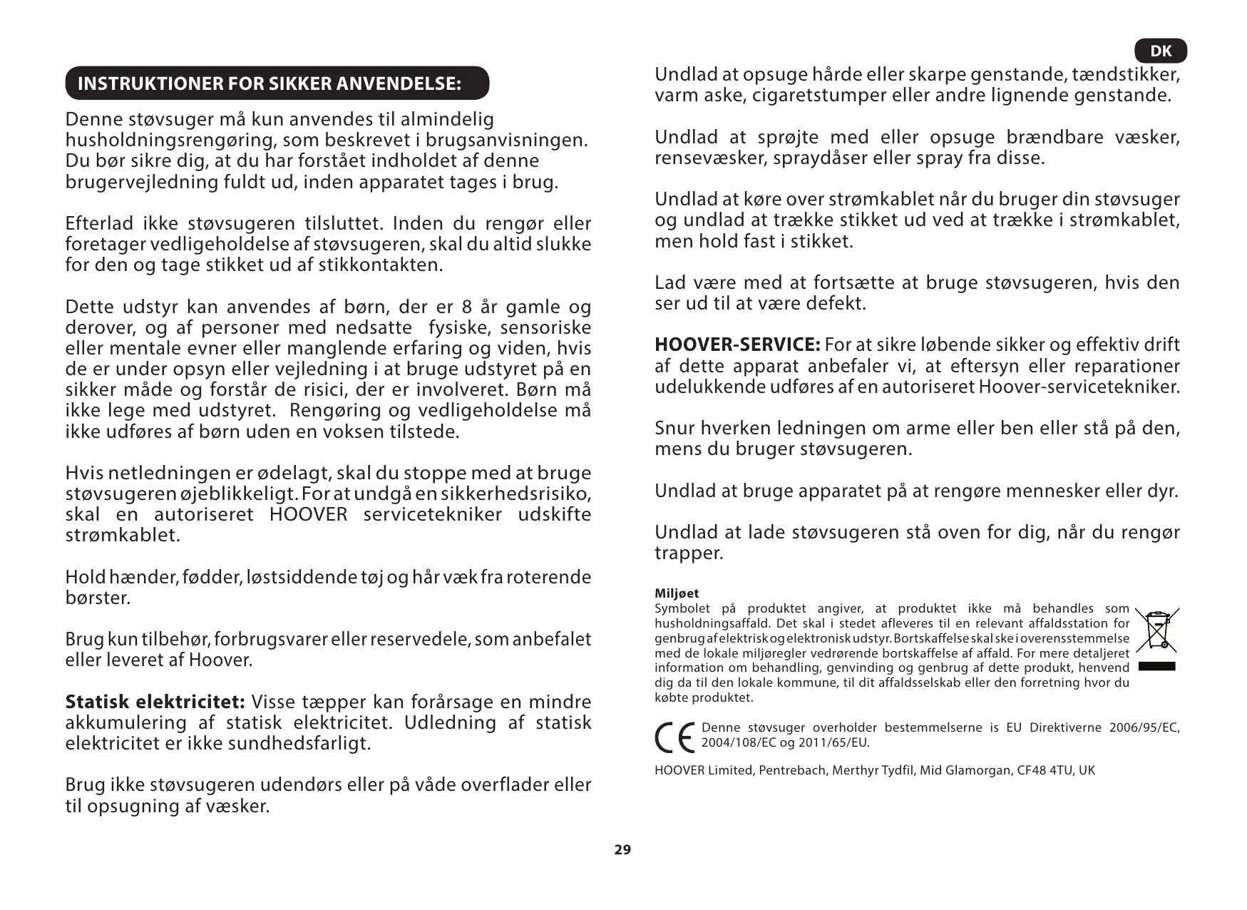 Service HOOVER: Pour assurer l’utilisation sûre et efficace de cet appareil, nous recommandons de n’en confier l’entretien ou les réparations qu’à un réparateur HOOVER agréé.