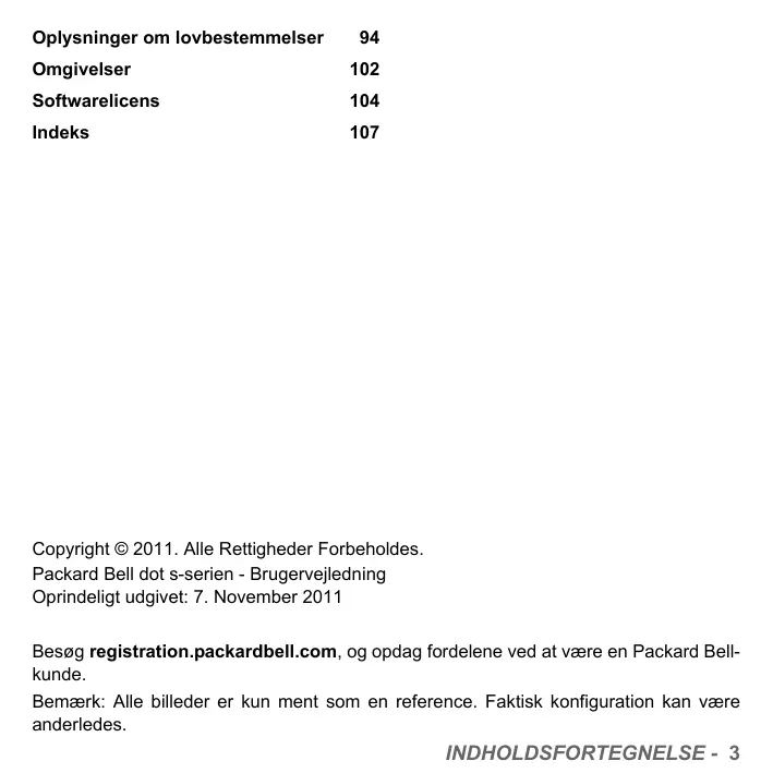 Copyright © 2011. Alle Rettigheder Forbeholdes. Packard Bell dot s-serien - Brugervejledning Oprindeligt udgivet: 7. November 2011 Besøg registration.packardbell.com, og opdag fordelene ved at være en Packard Bellkunde. Bemærk: Alle billeder er kun ment som en reference. Faktisk konfiguration kan være anderledes.