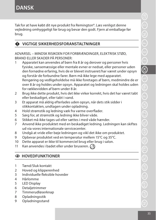 UA F VIGTIGE SIKKERHEDSFORANSTALTNINGER AE Tak for at have købt dit nye produkt fra Remington®. Læs venligst denne vejledning omhyggeligt før brug og bevar den godt. Fjern al emballage før brug.