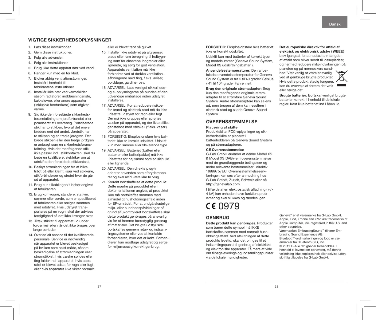 Det europæiske direktiv for affald af elektrisk og elektronisk udstyr ( WEEE ) blev igangsat for at nedsætte mængden af affald som bliver sendt til lossepladser, og hermed reducere miljøindvirkningen på planeten og på menneskers sundhed. Vær venlig at være ansvarlig ved at genbruge brugte produkter. Hvis dette produkt stadig fungerer, kan du overveje at forære det væk eller sælge det. Brugte batterier: Bortskaf venligst brugte batterier korrekt, i henhold til de lokale regler. Kast ikke batteriet ind i åben ild. FORSIGTIG: Eksplosionsfare hvis batteriet ikke er korrekt udskiftet. Udskift kun med batterier af korrekt type og modelnummer ( Geneva Sound System, Model XS udskiftningsbatteri ). Anvendelsestemperaturer: Den anbefalede anvendelsestemperatur for Geneva Sound System er fra 5 til 40 grader Celsius / 41 til 104 grader Fahrenheit. Brug den originale strømadapter: Brug kun den medfølgende originale strømadapter til at strømføre Geneva Sound System. Andre strømadaptere kan se ens ud, men brugen af dem kan resultere i elektrisk stød og skade Geneva Sound System. Overensstemmelse Placering af skilte Produktskilte, FCC-oplysninger og sikkerhedsskilte er placeret i batteriholderen på Geneva Sound System og på strømadapteren. CE Overensstemmelse G-Lab GmbH erklærer at denne Model XS & Model XS DAB+ er i overensstemmelse med de grundlæggende betingelser og andre relevante bestemmelser i direktiv 19999 / 5 / EC. Overensstemmelseserklæringen kan ses efter anmodning hos G-Lab GmbH, Zurich, Schweiz eller på http://genevalab.com. I tilfælde af en elektrostatisk afladning ( + / 4 kV ) kan enheden have funktionsproblemer og skal slukkes og tændes igen.