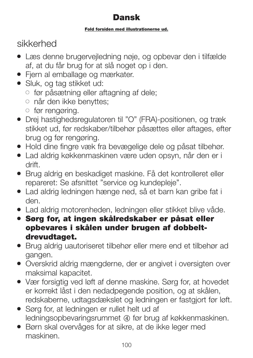 Læs denne brugervejledning nøje, og opbevar den i tilfælde af, at du får brug for at slå noget op i den. Fjern al emballage og mærkater. Sluk, og tag stikket ud: l før påsætning eller aftagning af dele; l når den ikke benyttes; l før rengøring. Drej hastighedsregulatoren til ”O” (FRA)-positionen, og træk stikket ud, før redskaber/tilbehør påsættes eller aftages, efter brug og før rengøring. Hold dine fingre væk fra bevægelige dele og påsat tilbehør. Lad aldrig køkkenmaskinen være uden opsyn, når den er i drift. Brug aldrig en beskadiget maskine. Få det kontrolleret eller repareret: Se afsnittet ”service og kundepleje”. Lad aldrig ledningen hænge ned, så et barn kan gribe fat i den. Lad aldrig motorenheden, ledningen eller stikket blive våde. Sørg for, at ingen skålredskaber er påsat eller opbevares i skålen under brugen af dobbeltdrevudtaget. Brug aldrig uautoriseret tilbehør eller mere end et tilbehør ad gangen. Overskrid aldrig mængderne, der er angivet i oversigten over maksimal kapacitet. Vær forsigtig ved løft af denne maskine. Sørg for, at hovedet er korrekt låst i den nedadpegende position, og at skålen, redskaberne, udtagsdækslet og ledningen er fastgjort før løft. Sørg for, at ledningen er rullet helt ud af ledningsopbevaringsrummet 4 før brug af køkkenmaskinen. Børn skal overvåges for at sikre, at de ikke leger med maskinen.