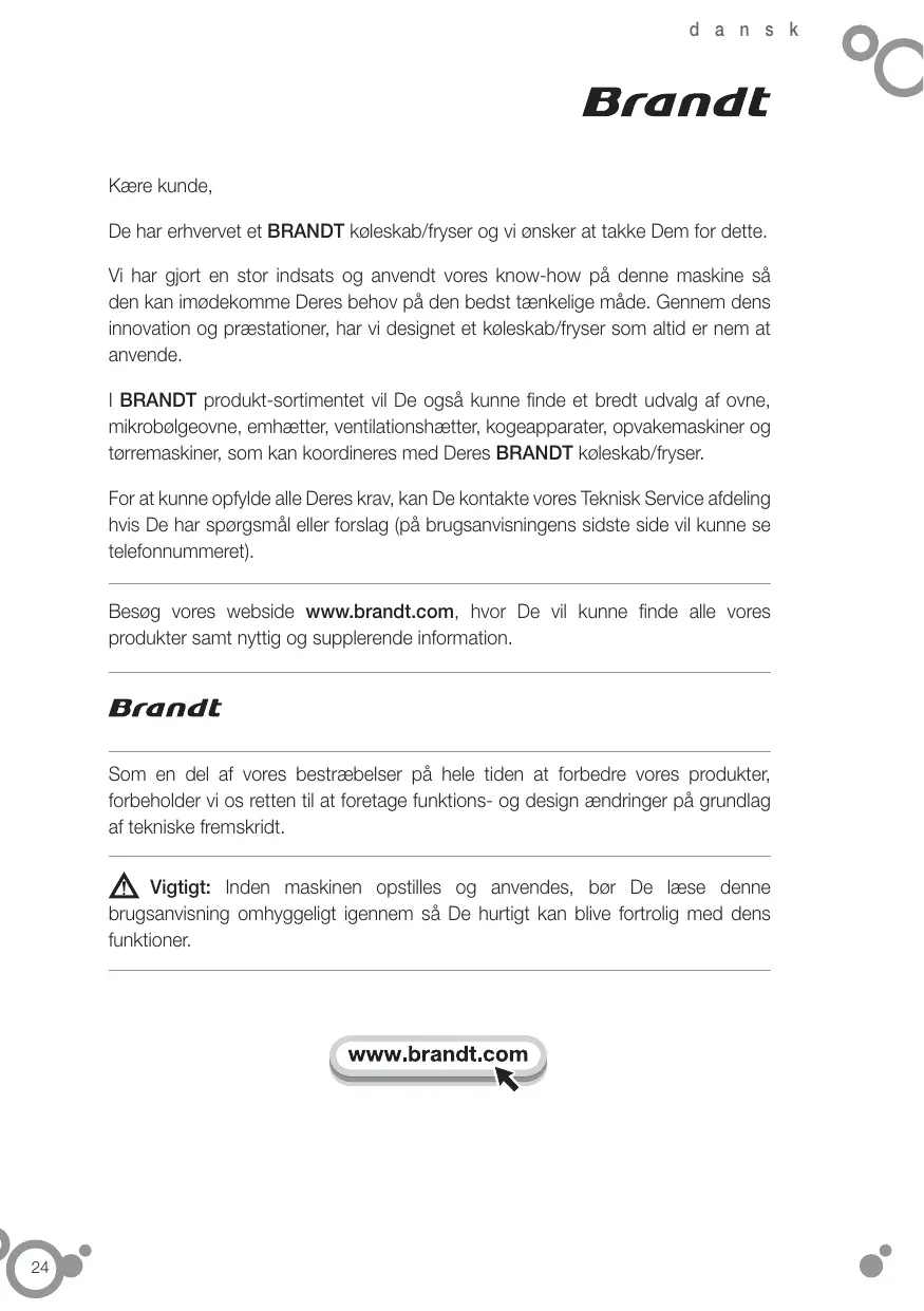 d a n s k Kære kunde, De har erhvervet et BRANDT køleskab/fryser og vi ønsker at takke Dem for dette. Vi har gjort en stor indsats og anvendt vores know-how på denne maskine så den kan imødekomme Deres behov på den bedst tænkelige måde. Gennem dens innovation og præstationer, har vi designet et køleskab/fryser som altid er nem at anvende. I BRANDT produkt-sortimentet vil De også kunne finde et bredt udvalg af ovne, mikrobølgeovne, emhætter, ventilationshætter, kogeapparater, opvakemaskiner og tørremaskiner, som kan koordineres med Deres BRANDT køleskab/fryser. For at kunne opfylde alle Deres krav, kan De kontakte vores Teknisk Service afdeling hvis De har spørgsmål eller forslag (på brugsanvisningens sidste side vil kunne se telefonnummeret). Besøg vores webside www.brandt.com, hvor De vil kunne finde alle vores produkter samt nyttig og supplerende information. Som en del af vores bestræbelser på hele tiden at forbedre vores produkter, forbeholder vi os retten til at foretage funktions- og design ændringer på grundlag af tekniske fremskridt. Vigtigt: Inden maskinen opstilles og anvendes, bør De læse denne brugsanvisning omhyggeligt igennem så De hurtigt kan blive fortrolig med dens funktioner.
