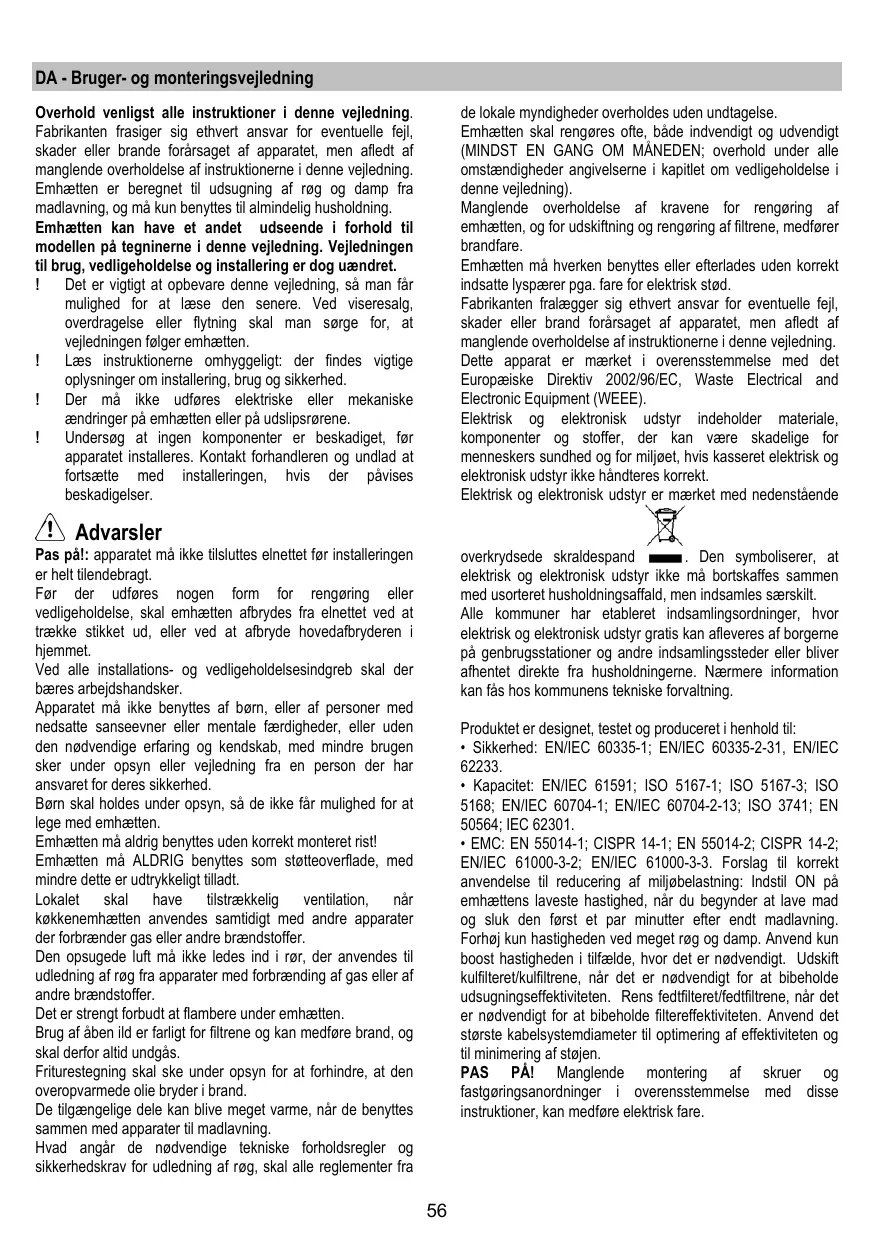 DA - Bruger- og monteringsvejledning de lokale myndigheder overholdes uden undtagelse. Emhætten skal rengøres ofte, både indvendigt og udvendigt (MINDST EN GANG OM MÅNEDEN; overhold under alle omstændigheder angivelserne i kapitlet om vedligeholdelse i denne vejledning). Manglende overholdelse af kravene for rengøring af emhætten, og for udskiftning og rengøring af filtrene, medfører brandfare. Emhætten må hverken benyttes eller efterlades uden korrekt indsatte lyspærer pga. fare for elektrisk stød. Fabrikanten fralægger sig ethvert ansvar for eventuelle fejl, skader eller brand forårsaget af apparatet, men afledt af manglende overholdelse af instruktionerne i denne vejledning. Dette apparat er mærket i overensstemmelse med det Europæiske Direktiv 2002/96/EC, Waste Electrical and Electronic Equipment (WEEE). Elektrisk og elektronisk udstyr indeholder materiale, komponenter og stoffer, der kan være skadelige for menneskers sundhed og for miljøet, hvis kasseret elektrisk og elektronisk udstyr ikke håndteres korrekt. Elektrisk og elektronisk udstyr er mærket med nedenstående Overhold venligst alle instruktioner i denne vejledning. Fabrikanten frasiger sig ethvert ansvar for eventuelle fejl, skader eller brande forårsaget af apparatet, men afledt af manglende overholdelse af instruktionerne i denne vejledning. Emhætten er beregnet til udsugning af røg og damp fra madlavning, og må kun benyttes til almindelig husholdning. Emhætten kan have et andet udseende i forhold til modellen på tegninerne i denne vejledning. Vejledningen til brug, vedligeholdelse og installering er dog uændret. Det er vigtigt at opbevare denne vejledning, så man får mulighed for at læse den senere. Ved viseresalg, overdragelse eller flytning skal man sørge for, at vejledningen følger emhætten. Læs instruktionerne omhyggeligt: der findes vigtige oplysninger om installering, brug og sikkerhed. Der må ikke udføres elektriske eller mekaniske ændringer på emhætten eller på udslipsrørene. Undersøg at ingen komponenter er beskadiget, før apparatet installeres. Kontakt forhandleren og undlad at fortsætte med installeringen, hvis der påvises beskadigelser. Advarsler Pas på!: apparatet må ikke tilsluttes elnettet før installeringen er helt tilendebragt. Før der udføres nogen form for rengøring eller vedligeholdelse, skal emhætten afbrydes fra elnettet ved at trække stikket ud, eller ved at afbryde hovedafbryderen i hjemmet. Ved alle installations- og vedligeholdelsesindgreb skal der bæres arbejdshandsker. Apparatet må ikke benyttes af børn, eller af personer med nedsatte sanseevner eller mentale færdigheder, eller uden den nødvendige erfaring og kendskab, med mindre brugen sker under opsyn eller vejledning fra en person der har ansvaret for deres sikkerhed. Børn skal holdes under opsyn, så de ikke får mulighed for at lege med emhætten. Emhætten må aldrig benyttes uden korrekt monteret rist! Emhætten må ALDRIG benyttes som støtteoverflade, med mindre dette er udtrykkeligt tilladt. Lokalet skal have tilstrækkelig ventilation, når køkkenemhætten anvendes samtidigt med andre apparater der forbrænder gas eller andre brændstoffer. Den opsugede luft må ikke ledes ind i rør, der anvendes til udledning af røg fra apparater med forbrænding af gas eller af andre brændstoffer. Det er strengt forbudt at flambere under emhætten. Brug af åben ild er farligt for filtrene og kan medføre brand, og skal derfor altid undgås. Friturestegning skal ske under opsyn for at forhindre, at den overopvarmede olie bryder i brand. De tilgængelige dele kan blive meget varme, når de benyttes sammen med apparater til madlavning. Hvad angår de nødvendige tekniske forholdsregler og sikkerhedskrav for udledning af røg, skal alle reglementer fra overkrydsede skraldespand . Den symboliserer, at elektrisk og elektronisk udstyr ikke må bortskaffes sammen med usorteret husholdningsaffald, men indsamles særskilt. Alle kommuner har etableret indsamlingsordninger, hvor elektrisk og elektronisk udstyr gratis kan afleveres af borgerne på genbrugsstationer og andre indsamlingssteder eller bliver afhentet direkte fra husholdningerne. Nærmere information kan fås hos kommunens tekniske forvaltning. Produktet er designet, testet og produceret i henhold til: