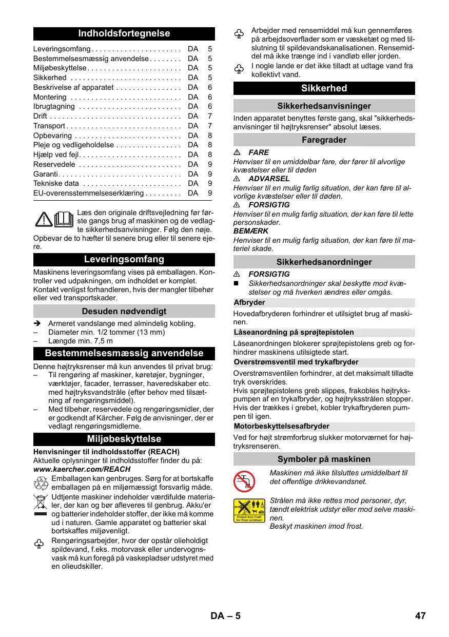 Ne pas diriger le jet haute pression sur des personnes, des animaux, un équipement électrique actif ou sur l'appareil lui-même. Mettre l'appareil à l'abri du gel.