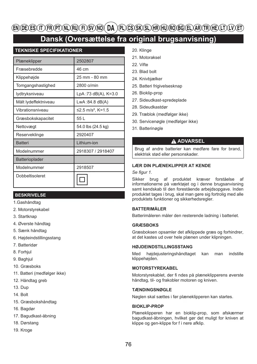 BRUGSANVISNING 2500207UC - 2500407UC - 2504707UA - G-MAX 2500207 GREENWORKS