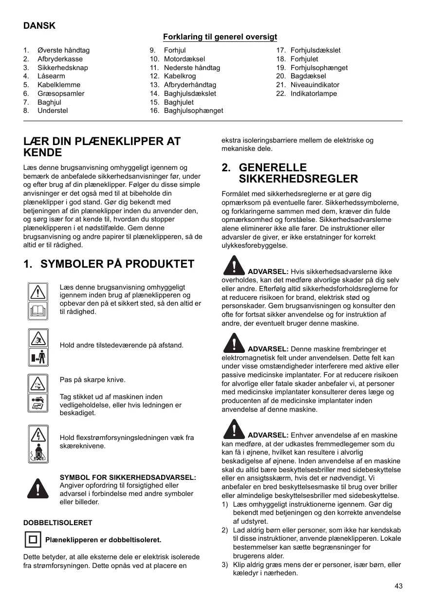 Læs denne brugsanvisning omhyggeligt igennem og bemærk de anbefalede sikkerhedsanvisninger før, under og efter brug af din plæneklipper. Følger du disse simple anvisninger er det også med til at bibeholde din plæneklipper i god stand. Gør dig bekendt med betjeningen af din plæneklipper inden du anvender den, og sørg især for at kende til, hvordan du stopper plæneklipperen i et nødstilfælde. Gem denne brugsanvisning og andre papirer til plæneklipperen, så de altid er til rådighed.