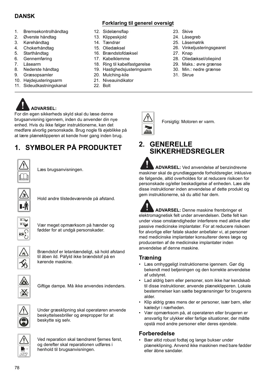 • Ne faites pas tourner le moteur dans un lieu confiné, en raison de la possibilité de dangereuses émanations de monoxyde de carbone. • Tondez uniquement à la lumière du jour ou dans une lumière artificielle de bonne qualité. • Évitez de tondre de l’herbe mouillée, si possible. • Assurez vos pas dans les pentes. • Marchez, ne courez jamais. • Pour les machines rotatives à roues, tondez les pentes dans le sens transversal, jamais en montant ou en descendant. • Soyez particulièrement prudent lors des changements de direction sur les terrains en pente. • Ne coupez pas l’herbe sur des pentes excessivement raides. • Faites particulièrement attention lorsque la tondeuse doit être tirée vers vous. • Arrêtez la/les lame(s) si la tondeuse thermique doit être inclinée pour le transport, lorsque vous traversez des zones sans herbe et lors des déplacements entre les surfaces à tondre. • N’utilisez jamais la tondeuse si ses protecteurs sont endommagés, ou en l’absence de dispositifs de sécurité, comme le déflecteur ou le sac de ramassage. • Ne changez pas les réglages du gouverneur du moteur et ne forcez pas le moteur. • Désengagez les lames et les vitesses avant de démarrer le moteur.