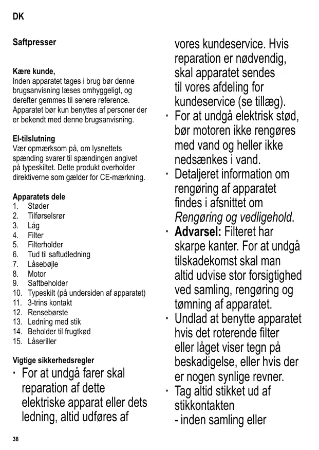 Breng dan de vergrendelclip omlaag en verwijder de stamper en deksel. ∙ Plaats uw linker hand onder de filterhouder en uw rechterhand onder de sapuitgang. Trek de filterhouder met een ‘wiebelende’ beweging omhoog (d.w.z. beurtelings links en rechts) totdat hij eraf komt. ∙ Verwijder de filterhouder en het filter. Sapcontainer Met de deksel op zijn plaats tijdens het uitschenken van het sap zal het schuim, wat tijdens de sap extractie is gevormd, in de container achterblijven. 2. Tubo de alimentación 3. Tapa 4. Filtro 5. Soporte del filtro 6. Salida de zumo 7. Clip de ajuste 8. Unidad de transmisión 9. Recipiente para el zumo 10. Placa de características (en la superficie inferior de la unidad) 11. Interruptor de 3 posiciones 12. Cepillo limpiador 13. Cable de alimentación con clavija 14. Recipiente para la pulpa 15. Huecos de ajuste Instrucciones importantes de seguridad