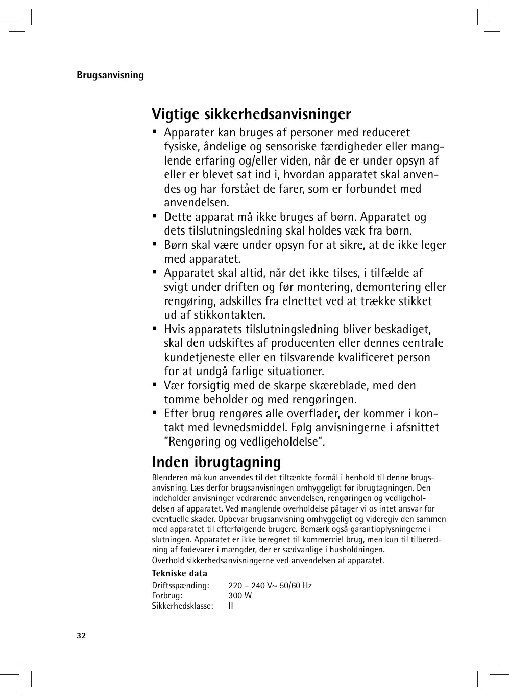 Tekniske data Driftsspænding: Forbrug: Sikkerhedsklasse: 32