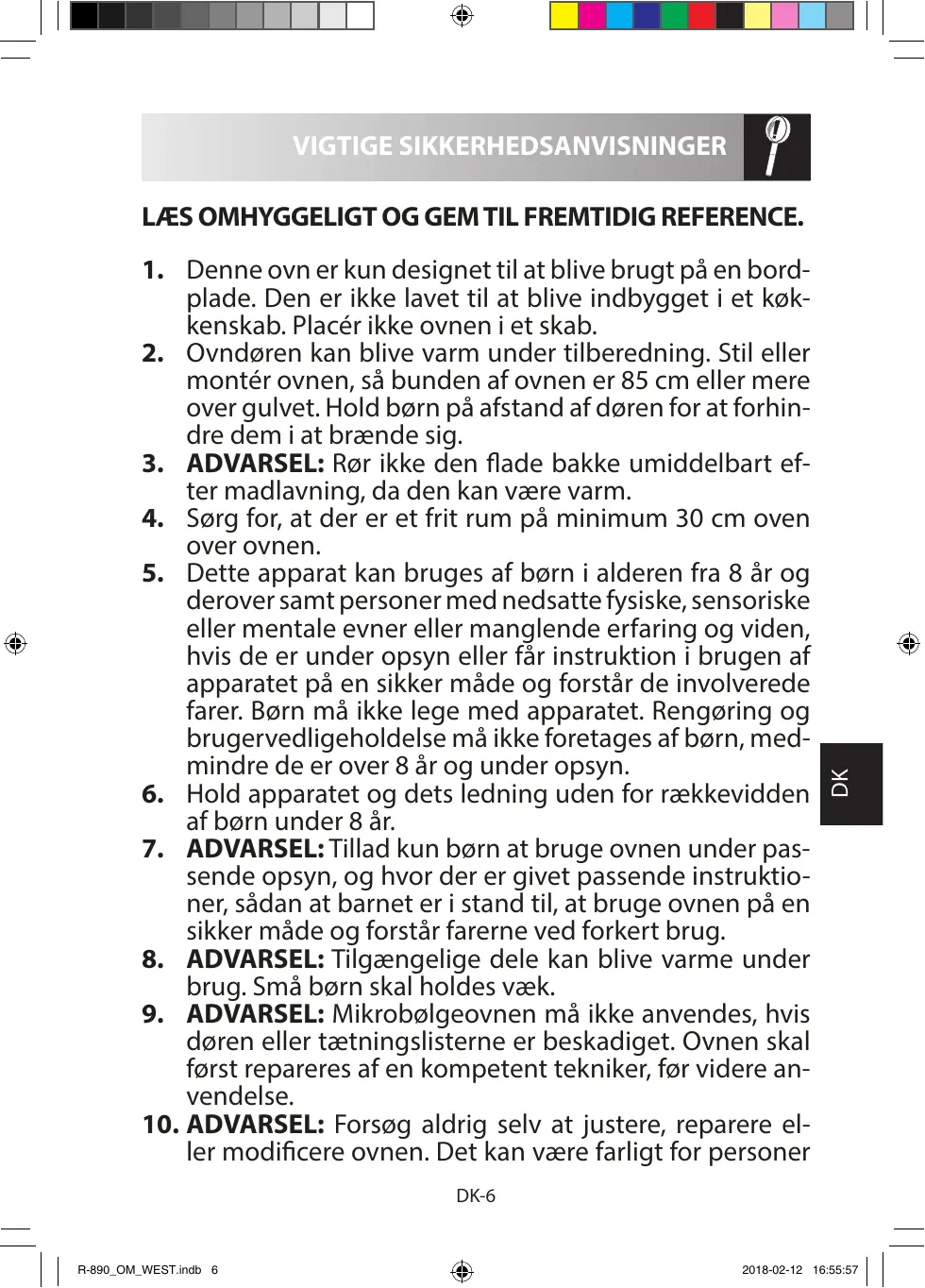 DK-5 R-890_OM_WEST.indb 5 2018-02-12 16:55:57 VIGTIGE SIKKERHEDSANVISNINGER 1. Denne ovn er kun designet til at blive brugt på en bordplade. Den er ikke lavet til at blive indbygget i et køkkenskab. Placér ikke ovnen i et skab.