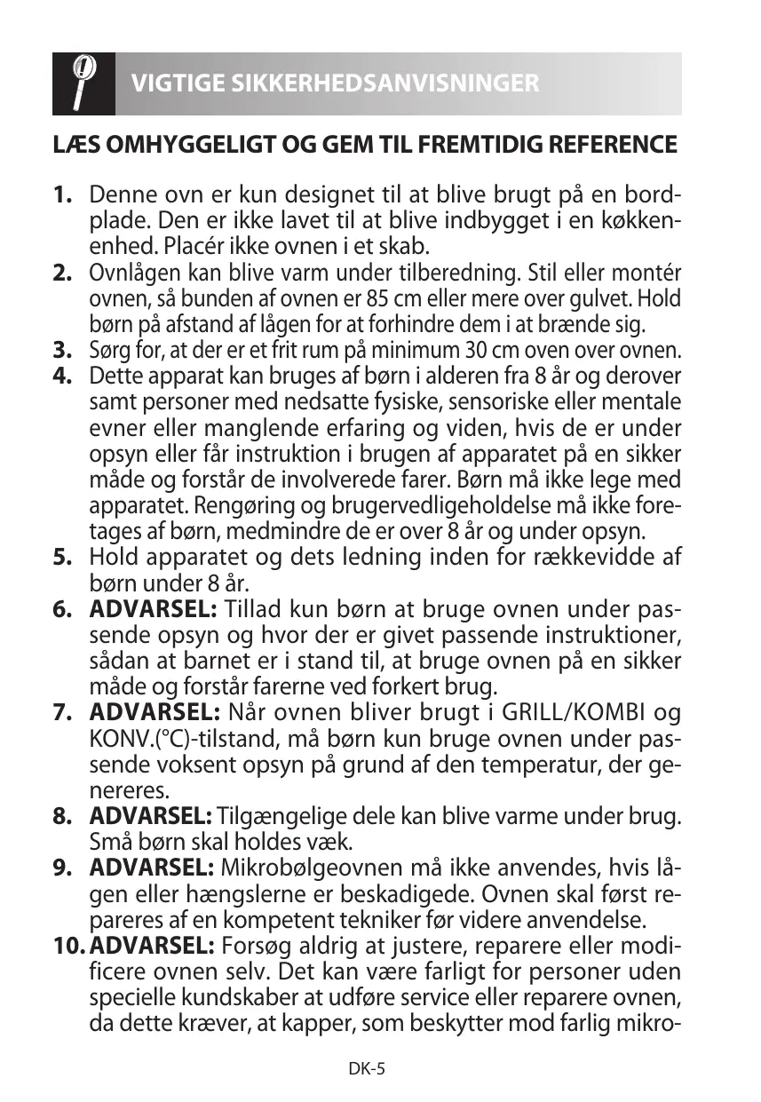 Lorsque vous réglez la température, le segment correspondant s'allume, tandis que les autres segments à sa gauche s'allument un par un pendant le processus de préchauffage. Option du menu auto : A1: Réchauffage A2 : Pomme de terre A3 : Viande 1. Ce four est conçu pour être uniquement utilisé sur un plan de travail de cuisine. Il n'est pas conçu pour être installé dans un élément de cuisine. Veuillez ne pas placer le four dans un placard. 2. La porte du four peut chauffer durant la cuisson. Placez ou montez le four afin que le bas du four soit à 85 cm ou plus au-dessus du sol. Gardez les enfants éloignés de la porte pour éviter qu'ils ne se brûlent. 3. Assurez-vous de garder un espace libre d'au moins 30 cm audessus du four. 4. Cet appareil peut être utilisé par des enfants de plus de 8 ans et des personnes aux capacités physiques, sensorielles ou mentales réduites, ou dont l'expérience et les connaissances sont insuffisantes, si elles sont supervisées ou si elles reçoivent des instructions relatives à l'utilisation de l'appareil. Les enfants ne doivent pas jouer avec l'appareil. Le nettoyage et l'entretien de l'appareil ne doivent pas être effectués par des enfants, à moins qu'ils n'aient plus de 8 ans et ne soient surveillés. 5. Gardez l'appareil et son cordon d'alimentation hors de portée des enfants de moins de 8 ans. 6. AVERTISSEMENT : Ne laissez un enfant utiliser le four sans supervision que si vous lui avez donné des instructions adéquates, afin que l'enfant soit capable d'utiliser le four de manière sûre et comprenne les dangers d'une utilisation abusive. 7. AVERTISSEMENT : Lorsque l'appareil est utilisé en mode GRIL/ COMBINÉ ou CONV.(°C), les enfants ne doivent utiliser le four que sous la supervision d'un adulte, en raison des hautes températures générées. 8. AVERTISSEMENT : Des pièces accessibles peuvent chauffer durant l'utilisation. Gardez les jeunes enfants à distance du four. 9. AVERTISSEMENT : Si la porte ou les joints de porte sont endommagés, n’utilisez pas le four jusqu’à ce qu’il soit réparé par une personne qualifiée. 10. AVERTISSEMENT : Veuillez ne rien réparer ou remplacer par vous-même dans le four. Faites appel à du personnel qualifié. F-5