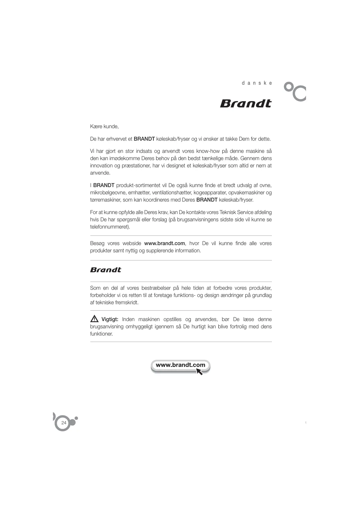 d a n s k e Kære kunde, De har erhvervet et BRANDT køleskab/fryser og vi ønsker at takke Dem for dette. Vi har gjort en stor indsats og anvendt vores know-how på denne maskine så den kan imødekomme Deres behov på den bedst tænkelige måde. Gennem dens innovation og præstationer, har vi designet et køleskab/fryser som altid er nem at anvende. I BRANDT produkt-sortimentet vil De også kunne finde et bredt udvalg af ovne, mikrobølgeovne, emhætter, ventilationshætter, kogeapparater, opvakemaskiner og tørremaskiner, som kan koordineres med Deres BRANDT køleskab/fryser. For at kunne opfylde alle Deres krav, kan De kontakte vores Teknisk Service afdeling hvis De har spørgsmål eller forslag (på brugsanvisningens sidste side vil kunne se telefonnummeret). Besøg vores webside www.brandt.com, hvor De vil kunne finde alle vores produkter samt nyttig og supplerende information. Som en del af vores bestræbelser på hele tiden at forbedre vores produkter, forbeholder vi os retten til at foretage funktions- og design ændringer på grundlag af tekniske fremskridt. Vigtigt: Inden maskinen opstilles og anvendes, bør De læse denne brugsanvisning omhyggeligt igennem så De hurtigt kan blive fortrolig med dens funktioner.