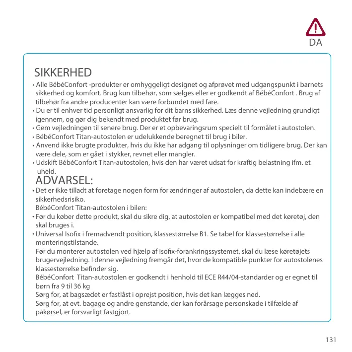 • Pour l’utilisation du système d’attache ISOFIX lisez IMPÉRATIVEMENT le manuel d’utilisation du véhicule, avant d’installer votre siège pour enfant. Il vous indiquera les places compatibles avec la classe de taille du siège pour enfant. • Titan de Maxi cosi a été approuvé selon les normes ECE R44 / 04 et convient aux enfants de 9 à 36 kg • Assurez-vous que le siège arrière rabattable est verrouillé. • L’utilisateur doit toujours veiller à ce que les bagages et autres objets susceptibles de causer des blessures à l’occupant du siège en cas de choc soient solidement arrimés.