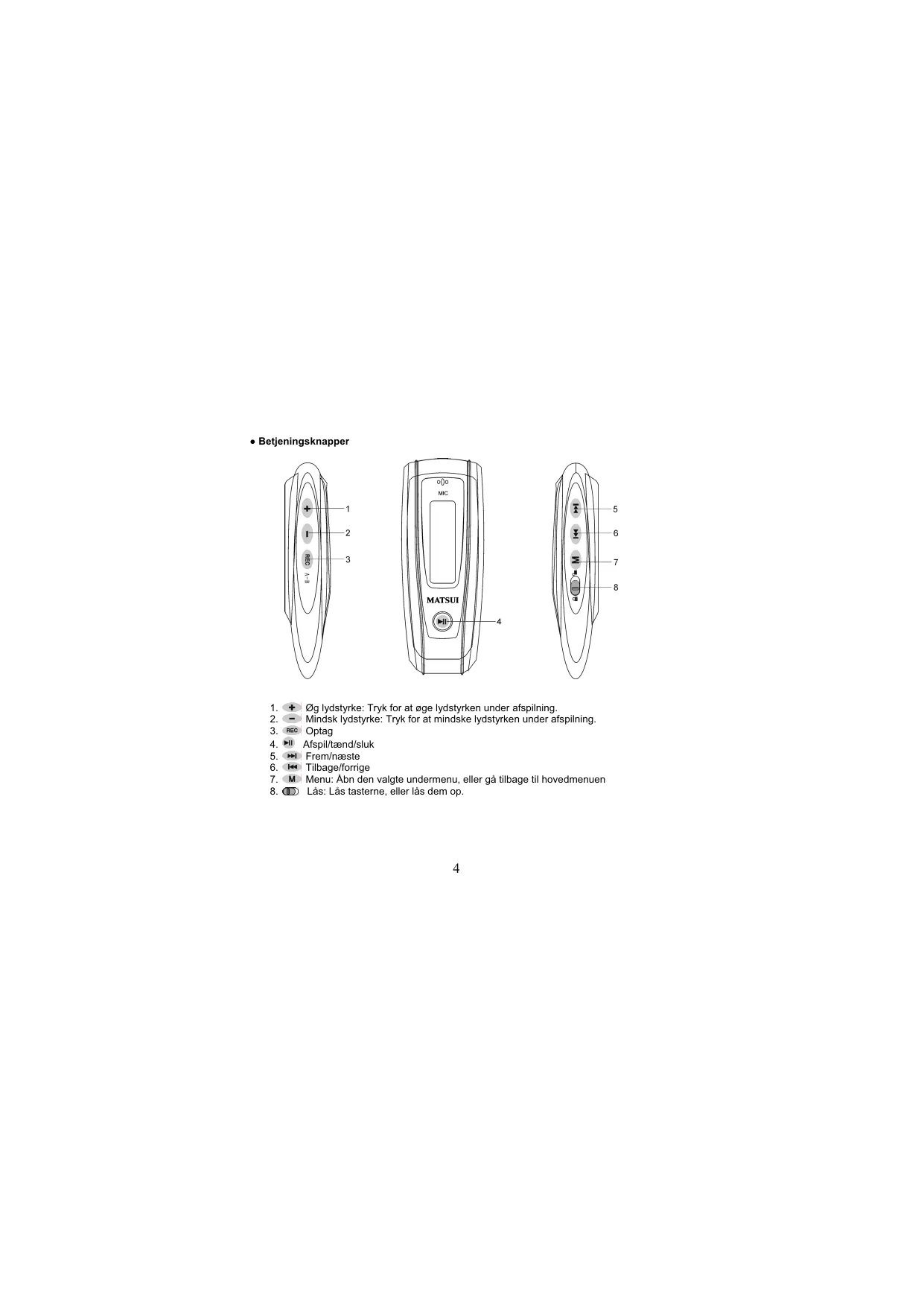 Øg lydstyrke: Tryk for at øge lydstyrken under afspilning. Mindsk lydstyrke: Tryk for at mindske lydstyrken under afspilning. Optag Afspil/tænd/sluk Frem/næste Tilbage/forrige Menu: Åbn den valgte undermenu, eller gå tilbage til hovedmenuen Lås: Lås tasterne, eller lås dem op.