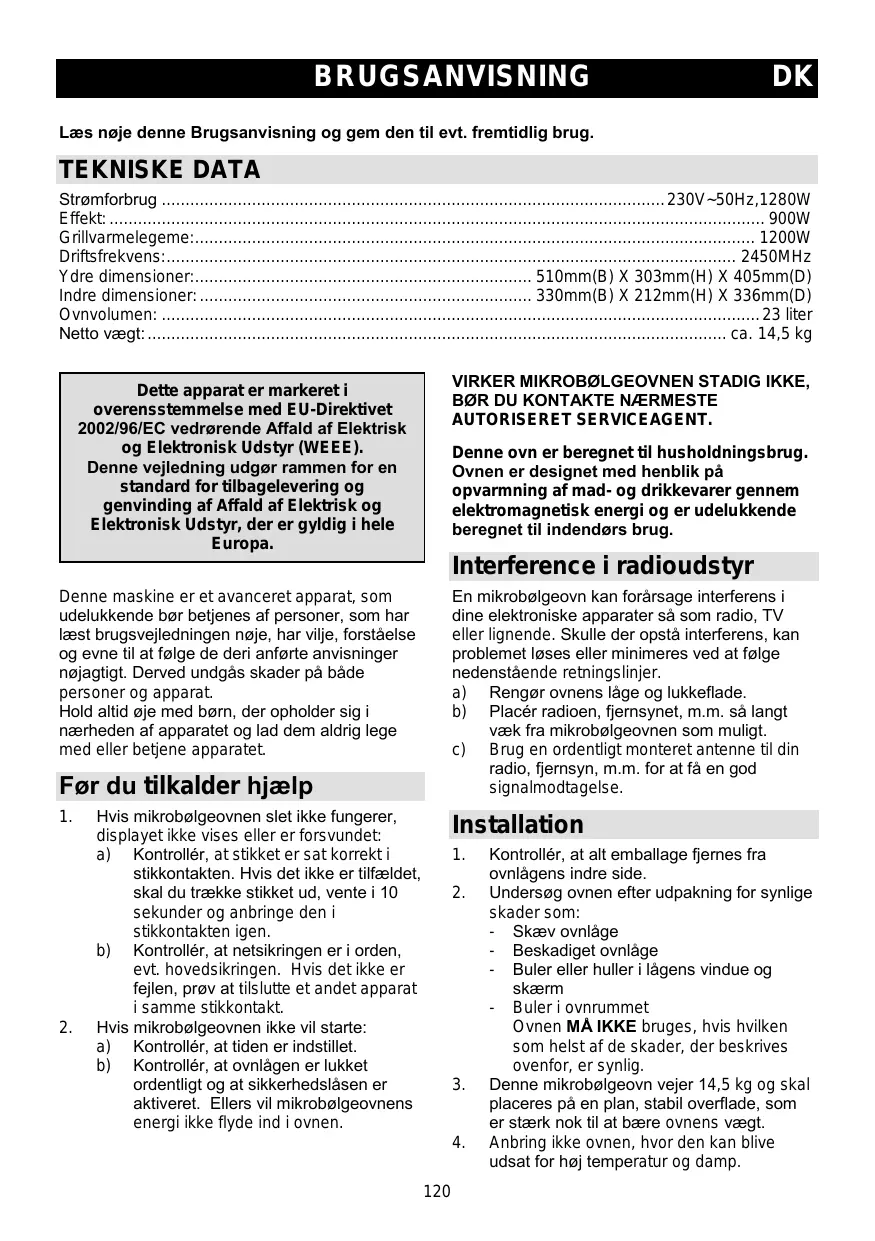AUTORISERET SERVICEAGENT. Dette apparat er markeret i overensstemmelse med EU-Direktivet 2002/96/EC vedrørende Affald af Elektrisk og Elektronisk Udstyr (WEEE). Denne vejledning udgør rammen for en standard for tilbagelevering og genvinding af Affald af Elektrisk og Elektronisk Udstyr, der er gyldig i hele Europa. Denne ovn er beregnet til husholdningsbrug. Ovnen er designet med henblik på opvarmning af mad- og drikkevarer gennem elektromagnetisk energi og er udelukkende beregnet til indendørs brug. Interference i radioudstyr En mikrobølgeovn kan forårsage interferens i dine elektroniske apparater så som radio, TV eller lignende. Skulle der opstå interferens, kan problemet løses eller minimeres ved at følge nedenstående retningslinjer. a) Rengør ovnens låge og lukkeflade. b) Placér radioen, fjernsynet, m.m. så langt væk fra mikrobølgeovnen som muligt. c) Brug en ordentligt monteret antenne til din radio, fjernsyn, m.m. for at få en god signalmodtagelse. Denne maskine er et avanceret apparat, som udelukkende bør betjenes af personer, som har læst brugsvejledningen nøje, har vilje, forståelse og evne til at følge de deri anførte anvisninger nøjagtigt. Derved undgås skader på både personer og apparat. Hold altid øje med børn, der opholder sig i nærheden af apparatet og lad dem aldrig lege med eller betjene apparatet. Før du tilkalder hjælp