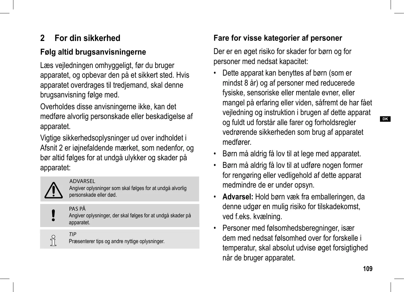 For din sikkerhed Følg altid brugsanvisningerne Læs vejledningen omhyggeligt, før du bruger apparatet, og opbevar den på et sikkert sted. Hvis apparatet overdrages til tredjemand, skal denne brugsanvisning følge med. Overholdes disse anvisningerne ikke, kan det medføre alvorlig personskade eller beskadigelse af apparatet. Vigtige sikkerhedsoplysninger ud over indholdet i Afsnit 2 er iøjnefaldende mærket, som nedenfor, og bør altid følges for at undgå ulykker og skader på apparatet: ADVARSEL Angiver oplysninger som skal følges for at undgå alvorlig personskade eller død. PAS PÅ Angiver oplysninger, der skal følges for at undgå skader på apparatet. TIP Præsenterer tips og andre nyttige oplysninger. Fare for visse kategorier af personer Der er en øget risiko for skader for børn og for personer med nedsat kapacitet: