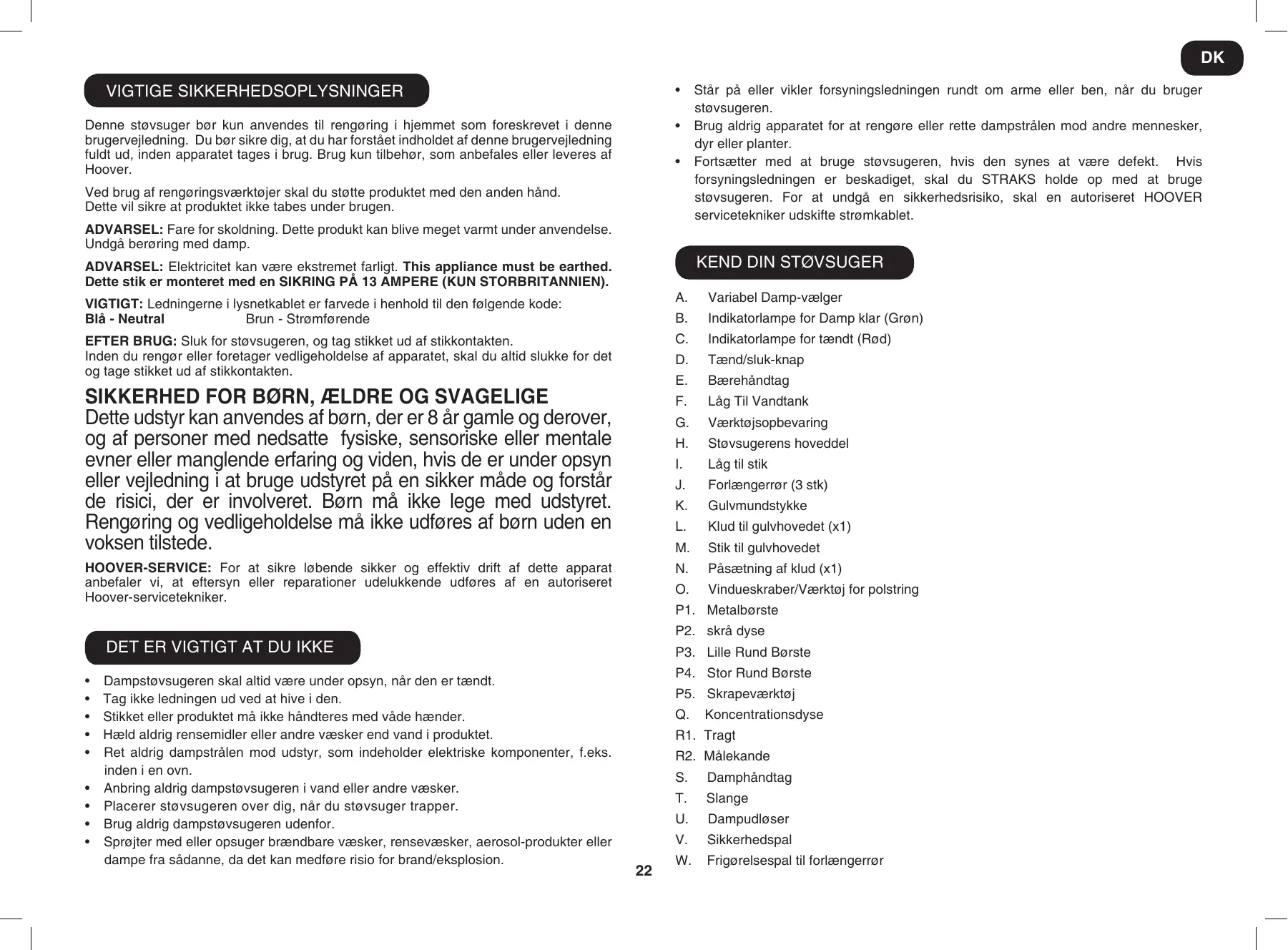 Ved brug af rengøringsværktøjer skal du støtte produktet med den anden hånd. Dette vil sikre at produktet ikke tabes under brugen. ADVARSEL: Fare for skoldning. Dette produkt kan blive meget varmt under anvendelse. Undgå berøring med damp. Står på eller vikler forsyningsledningen rundt om arme eller ben, når du bruger støvsugeren. Brug aldrig apparatet for at rengøre eller rette dampstrålen mod andre mennesker, dyr eller planter. Fortsætter med at bruge støvsugeren, hvis den synes at være defekt. Hvis forsyningsledningen er beskadiget, skal du STRAKS holde op med at bruge støvsugeren. For at undgå en sikkerhedsrisiko, skal en autoriseret HOOVER servicetekniker udskifte strømkablet. Kend din støvsuger ADVARSEL: Elektricitet kan være ekstremet farligt. This appliance must be earthed. Dette stik er monteret med en sikring på 13 ampere (kun Storbritannien). Vigtigt: Ledningerne i lysnetkablet er farvede i henhold til den følgende kode: Blå - Neutral Brun - Strømførende
