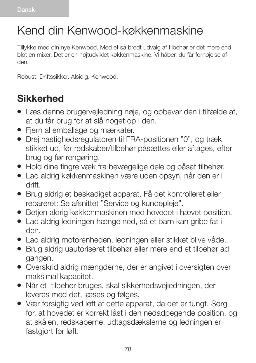 Kend din Kenwood-køkkenmaskine Tillykke med din nye Kenwood. Med et så bredt udvalg af tilbehør er det mere end blot en mixer. Det er en højtudviklet køkkenmaskine. Vi håber, du får fornøjelse af den. Robust. Driftssikker. Alsidig. Kenwood.