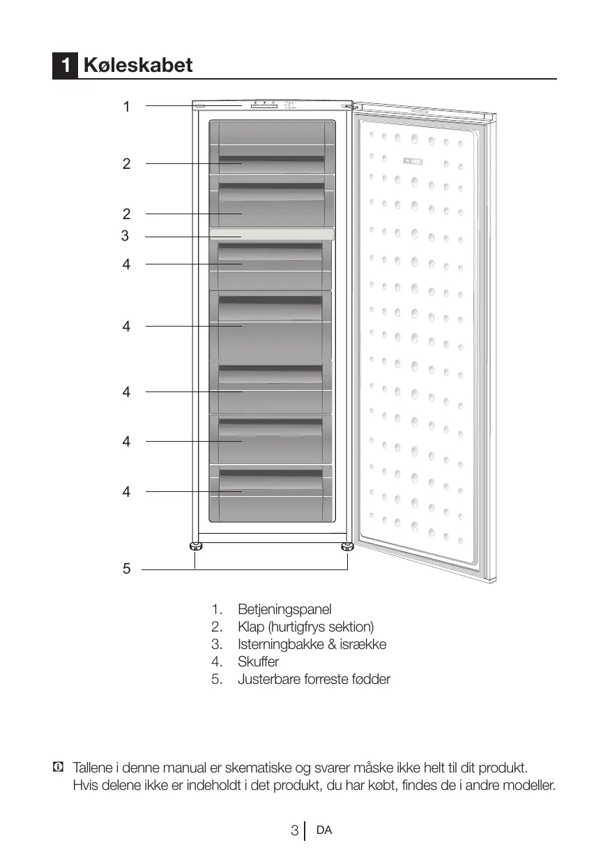 Betjeningspanel Klap (hurtigfrys sektion) Isterningbakke & isrække Skuffer Justerbare forreste fødder