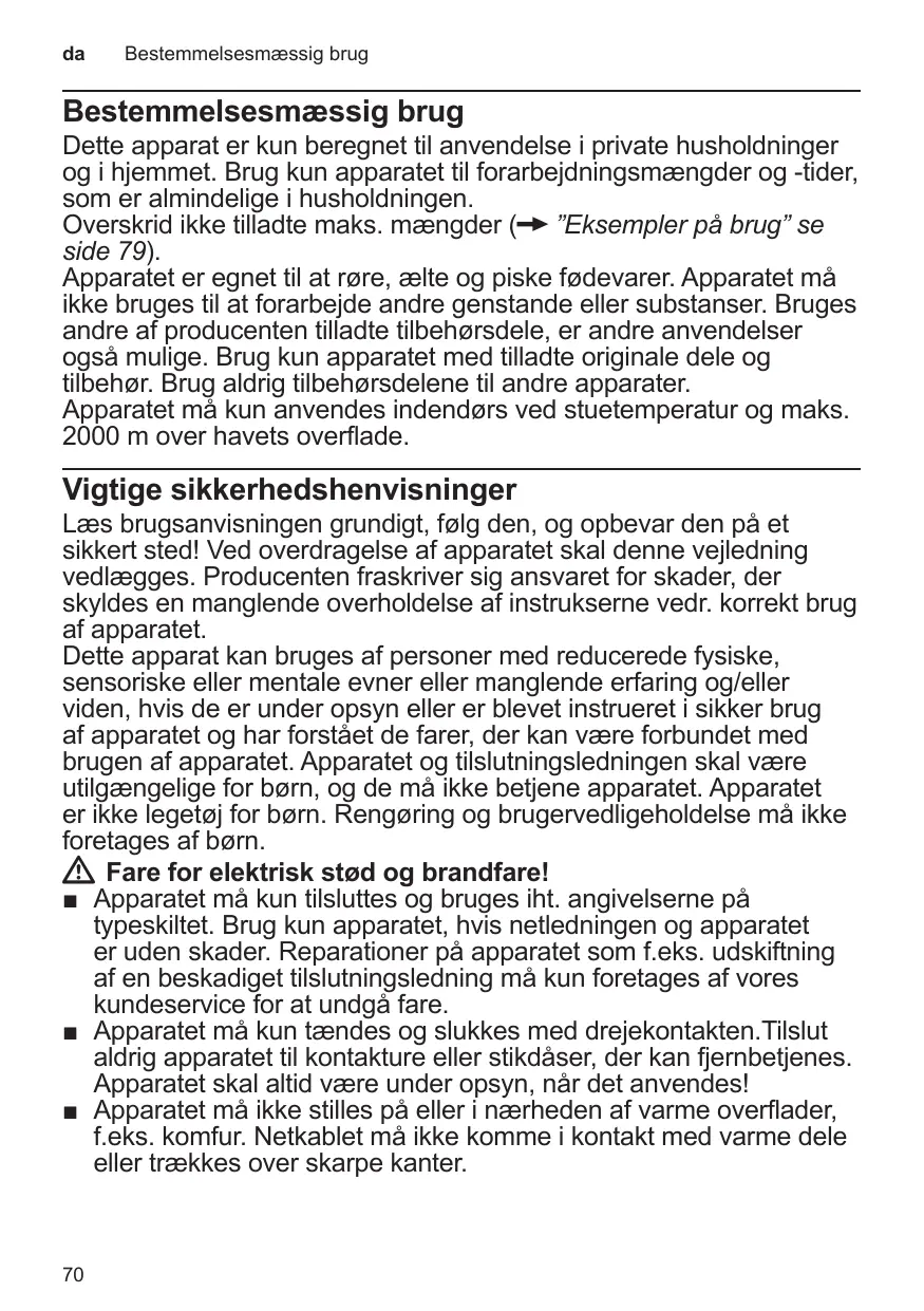 Bestemmelsesmæssig brug Bestemmelsesmæssig brug Dette apparat er kun beregnet til anvendelse i private husholdninger og i hjemmet. Brug kun apparatet til forarbejdningsmængder og -tider, som er almindelige i husholdningen. Overskrid ikke tilladte maks. mængder (X ”Eksempler på brug” se side 79). Apparatet er egnet til at røre, ælte og piske fødevarer. Apparatet må ikke bruges til at forarbejde andre genstande eller substanser. Bruges andre af producenten tilladte tilbehørsdele, er andre anvendelser også mulige. Brug kun apparatet med tilladte originale dele og tilbehør. Brug aldrig tilbehørsdelene til andre apparater. Apparatet må kun anvendes indendørs ved stuetemperatur og maks. 2000 m over havets overflade. Vigtige sikkerhedshenvisninger Læs brugsanvisningen grundigt, følg den, og opbevar den på et sikkert sted! Ved overdragelse af apparatet skal denne vejledning vedlægges. Producenten fraskriver sig ansvaret for skader, der skyldes en manglende overholdelse af instrukserne vedr. korrekt brug af apparatet. Dette apparat kan bruges af personer med reducerede fysiske, sensoriske eller mentale evner eller manglende erfaring og/eller viden, hvis de er under opsyn eller er blevet instrueret i sikker brug af apparatet og har forstået de farer, der kan være forbundet med brugen af apparatet. Apparatet og tilslutningsledningen skal være utilgængelige for børn, og de må ikke betjene apparatet. Apparatet er ikke legetøj for børn. Rengøring og brugervedligeholdelse må ikke foretages af børn. WW Fare for elektrisk stød og brandfare! ■■ Apparatet må kun tilsluttes og bruges iht. angivelserne på typeskiltet. Brug kun apparatet, hvis netledningen og apparatet er uden skader. Reparationer på apparatet som f.eks. udskiftning af en beskadiget tilslutningsledning må kun foretages af vores kundeservice for at undgå fare. ■■ Apparatet må kun tændes og slukkes med drejekontakten.Tilslut aldrig apparatet til kontakture eller stikdåser, der kan fjernbetjenes. Apparatet skal altid være under opsyn, når det anvendes! ■■ Apparatet må ikke stilles på eller i nærheden af varme overflader, f.eks. komfur. Netkablet må ikke komme i kontakt med varme dele eller trækkes over skarpe kanter.