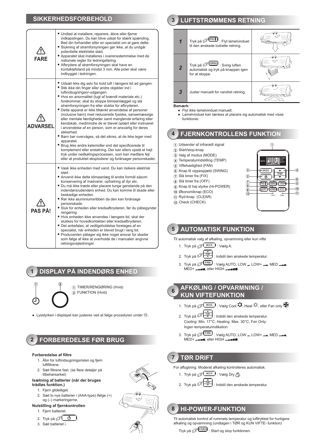 16 FUNKTION OG ANVENDELSE 1. Treminutters beskyttelsesfunktion: Anvendes til at beskytte enheden mod at blive aktiveret i 3 minutter, hvis den pludseligt genstartes eller TÆNDES. 2. Foropvarmning: Varm enheden op i 5 minutter før opvarmningsfunktionen anvendes. 3. Kontrol af varm luft: Når rummets temperatur når den indstillede temperatur, reduceres viftehastigheden automatisk, og den udendørs enhed stopper. 4. Automatisk affrostning: Viften stopper under affrostning. 5. Opvarmningskapacitet: Varmen absorberes udefra og slippes ind i rummet. Hvis temperaturen udenfor er lav, så anvend et andet anbefalet opvarmningsapparat i kombination med klimaanlægget. 6. Vedrørende sneansamlinger: Vælg en placering til den udendørs enhed, hvor den ikke udsættes for snefygning, nedfaldne blade eller andet årstidsbetonet nedfald. 7. Der kan forekomme en lav knaselyd, når enheden anvendes. Dette er normalt, idet knaselyden kan være forårsaget af udvidelse/ sammentrækning af plastik. Bemærk: Punkt 2 til 6 for opvarmningsmodellen