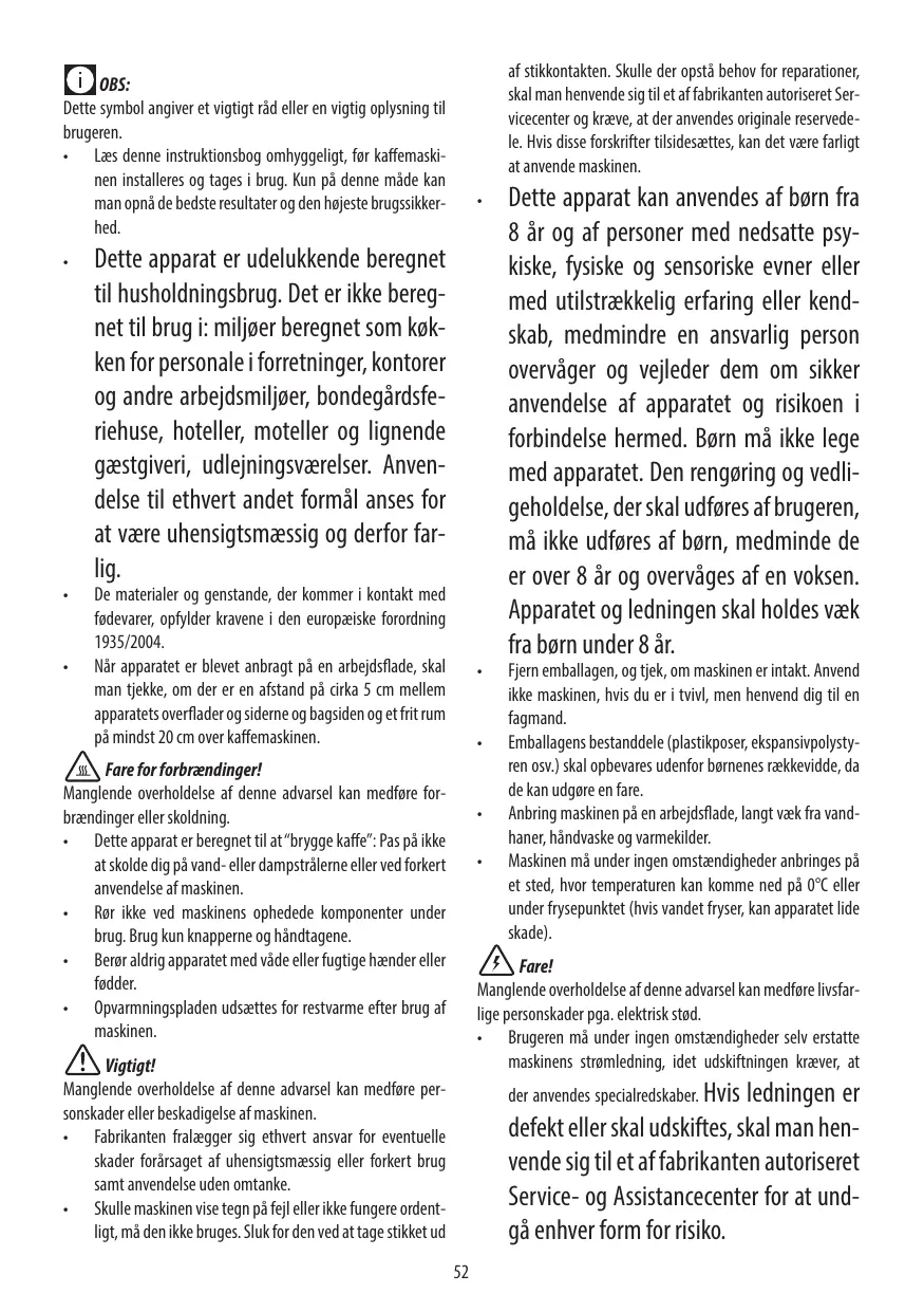 Les matières et les objets destinés au contact avec des produits alimentaires sont conformes au règlement européen 1935/2004. Après avoir placé l’appareil sur le plan de travail, assurez-vous qu’il reste un espace d’environ 5 cm tout autour de la machine à café et de 20 cm au moins au-dessus.