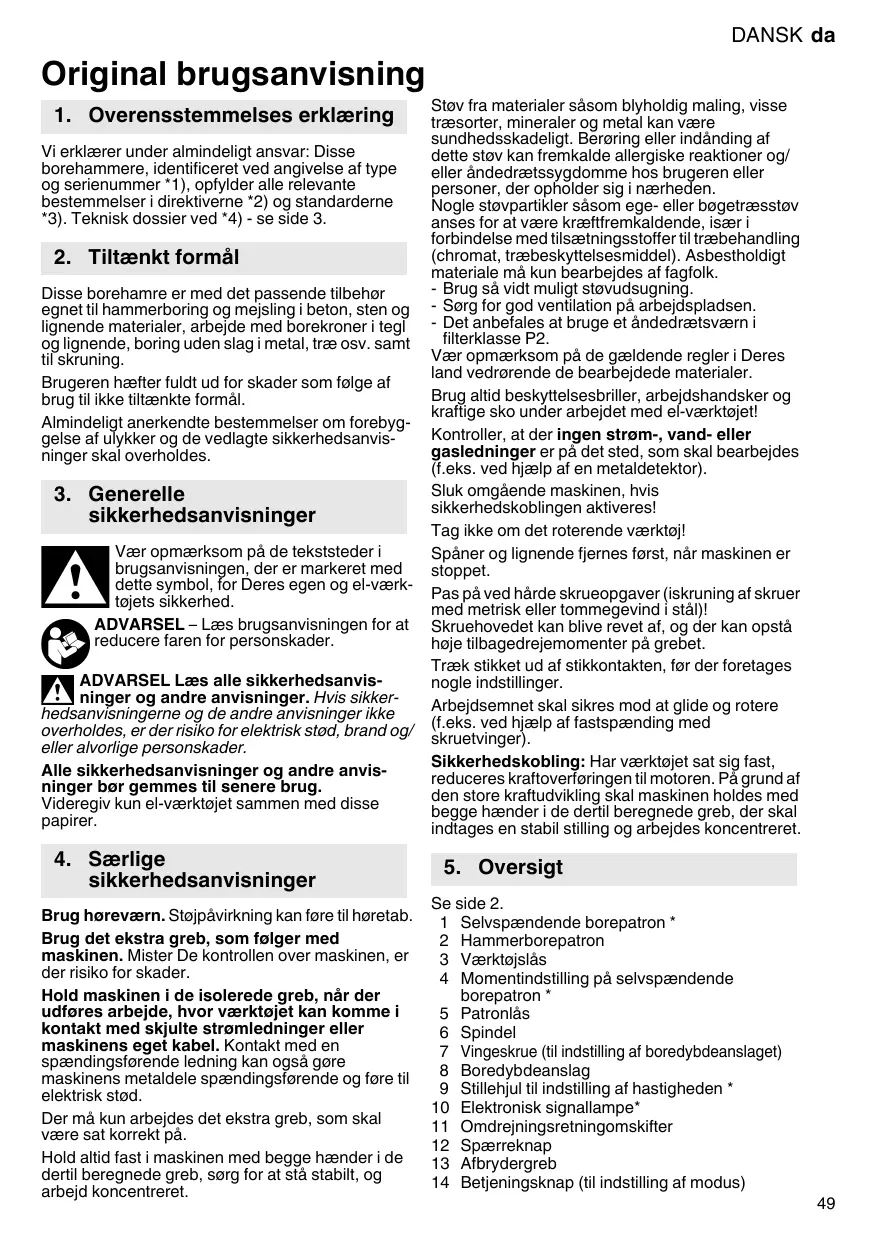 2. Utilisation conforme à la destination Equipé des accessoires correspondants, ces perceuses à percussion sont prévues pour travailler avec des forets marteau et des burins dans le béton, la pierre ou des matériaux similaires, et avec des trépans dans les tuiles, etc., ainsi que pour percer sans percussion dans le métal, le bois, etc. ou pour serrer des vis. L'utilisateur sera entièrement responsable de tous dommages résultant d'une utilisation non conforme à la destination de l'appareil. Il est impératif de respecter les consignes générales de protection contre les accidents ainsi que les consignes de sécurité ci-jointes.