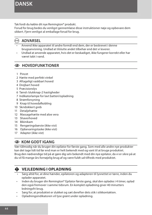 DANSK Tak fordi du købte dit nye Remington® produkt. Forud for brug bedes du venligst gennemlæse disse instruktioner nøje og opbevare dem sikkert. Fjern venligst al emballage forud for brug. A ADVARSEL