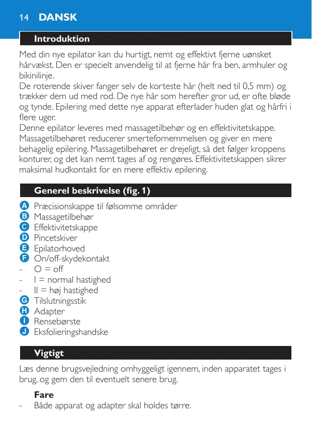 Præcisionskappe til følsomme områder Massagetilbehør Effektivitetskappe Pincetskiver Epilatorhoved On/off-skydekontakt O = off I = normal hastighed II = høj hastighed Tilslutningsstik Adapter Rensebørste Eksfolieringshandske Vigtigt Læs denne brugsvejledning omhyggeligt igennem, inden apparatet tages i brug, og gem den til eventuelt senere brug.