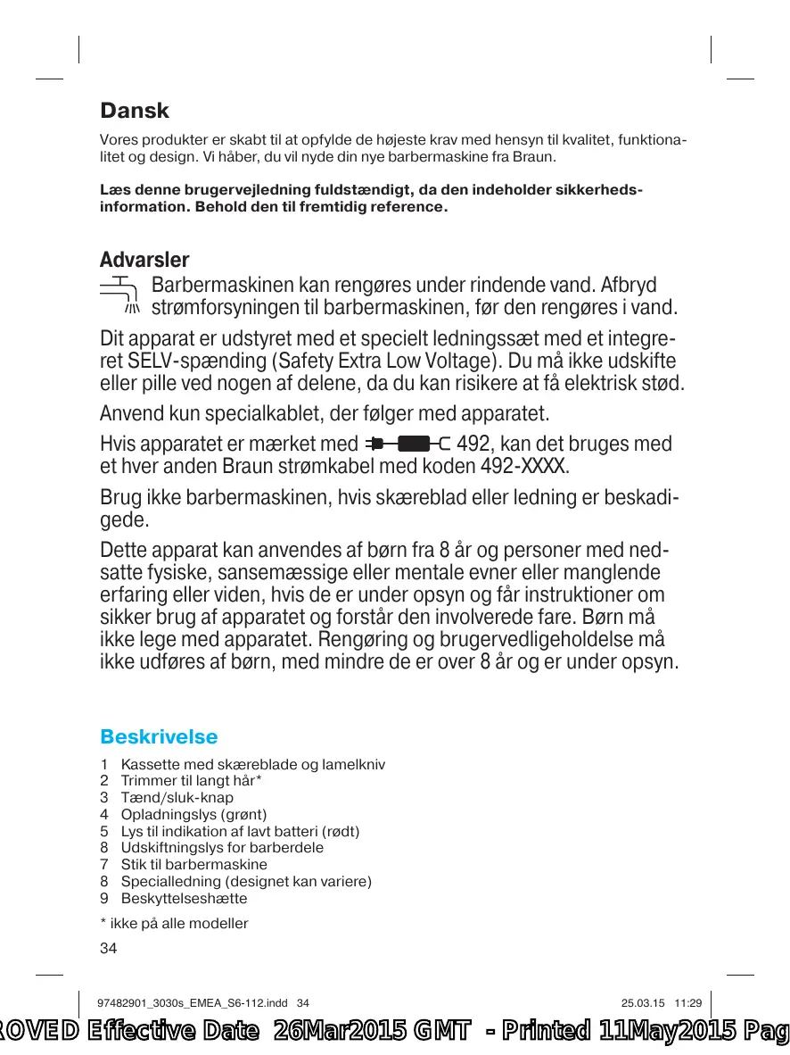 Advarsler Barbermaskinen kan rengøres under rindende vand. Afbryd strømforsyningen til barbermaskinen, før den rengøres i vand. Dit apparat er udstyret med et specielt ledningssæt med et integreret SELV-spænding (Safety Extra Low Voltage). Du må ikke udskifte eller pille ved nogen af delene, da du kan risikere at få elektrisk stød. Anvend kun specialkablet, der følger med apparatet. Hvis apparatet er mærket med 492, kan det bruges med et hver anden Braun strømkabel med koden 492-XXXX. Brug ikke barbermaskinen, hvis skæreblad eller ledning er beskadigede. Dette apparat kan anvendes af børn fra 8 år og personer med nedsatte fysiske, sansemæssige eller mentale evner eller manglende erfaring eller viden, hvis de er under opsyn og får instruktioner om sikker brug af apparatet og forstår den involverede fare. Børn må ikke lege med apparatet. Rengøring og brugervedligeholdelse må ikke udføres af børn, med mindre de er over 8 år og er under opsyn.