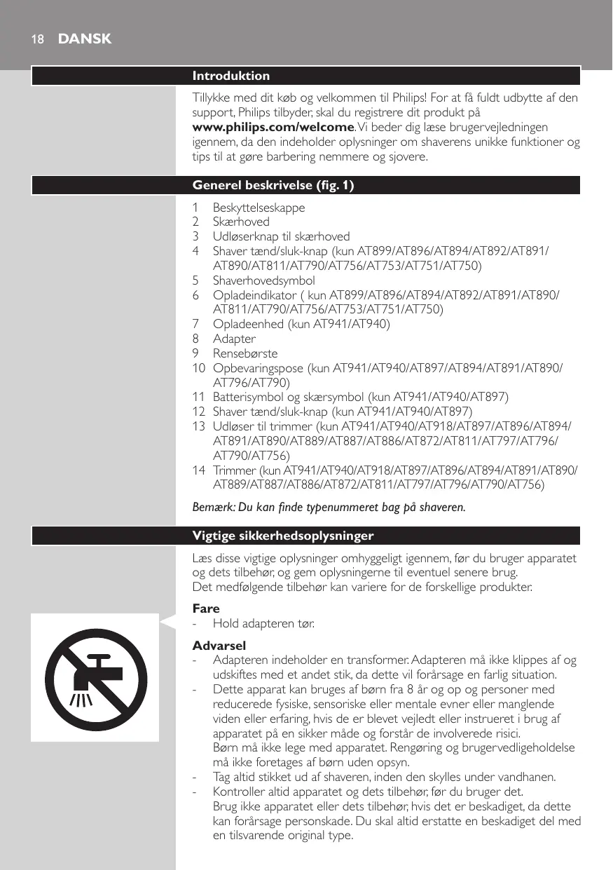 Beskyttelseskappe Skærhoved Udløserknap til skærhoved Shaver tænd/sluk-knap (kun AT899/AT896/AT894/AT892/AT891/ AT890/AT811/AT790/AT756/AT753/AT751/AT750) Shaverhovedsymbol Opladeindikator ( kun AT899/AT896/AT894/AT892/AT891/AT890/ AT811/AT790/AT756/AT753/AT751/AT750) Opladeenhed (kun AT941/AT940) Adapter Rensebørste Opbevaringspose (kun AT941/AT940/AT897/AT894/AT891/AT890/ AT796/AT790) Batterisymbol og skærsymbol (kun AT941/AT940/AT897) Shaver tænd/sluk-knap (kun AT941/AT940/AT897) Udløser til trimmer (kun AT941/AT940/AT918/AT897/AT896/AT894/ AT891/AT890/AT889/AT887/AT886/AT872/AT811/AT797/AT796/ AT790/AT756) Trimmer (kun AT941/AT940/AT918/AT897/AT896/AT894/AT891/AT890/ AT889/AT887/AT886/AT872/AT811/AT797/AT796/AT790/AT756) Bemærk: Du kan finde typenummeret bag på shaveren. Vigtige sikkerhedsoplysninger Læs disse vigtige oplysninger omhyggeligt igennem, før du bruger apparatet og dets tilbehør, og gem oplysningerne til eventuel senere brug. Det medfølgende tilbehør kan variere for de forskellige produkter. Fare -- Hold adapteren tør. Advarsel -- Adapteren indeholder en transformer. Adapteren må ikke klippes af og udskiftes med et andet stik, da dette vil forårsage en farlig situation. -- Dette apparat kan bruges af børn fra 8 år og op og personer med reducerede fysiske, sensoriske eller mentale evner eller manglende viden eller erfaring, hvis de er blevet vejledt eller instrueret i brug af apparatet på en sikker måde og forstår de involverede risici. Børn må ikke lege med apparatet. Rengøring og brugervedligeholdelse må ikke foretages af børn uden opsyn. -- Tag altid stikket ud af shaveren, inden den skylles under vandhanen. -- Kontroller altid apparatet og dets tilbehør, før du bruger det. Brug ikke apparatet eller dets tilbehør, hvis det er beskadiget, da dette kan forårsage personskade. Du skal altid erstatte en beskadiget del med en tilsvarende original type. DANSK