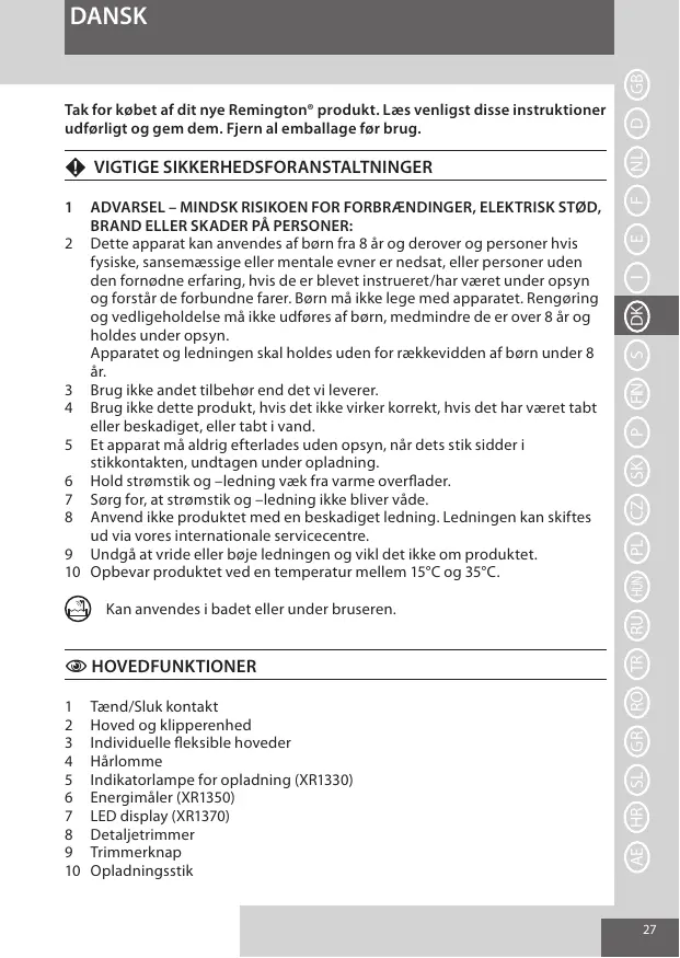 Tak for købet af dit nye Remington® produkt. Læs venligst disse instruktioner udførligt og gem dem. Fjern al emballage før brug.