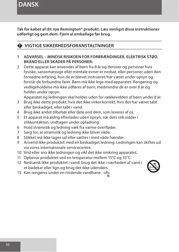 DANSK Tak for købet af dit nye Remington® produkt. Læs venligst disse instruktioner udførligt og gem dem. Fjern al emballage før brug.