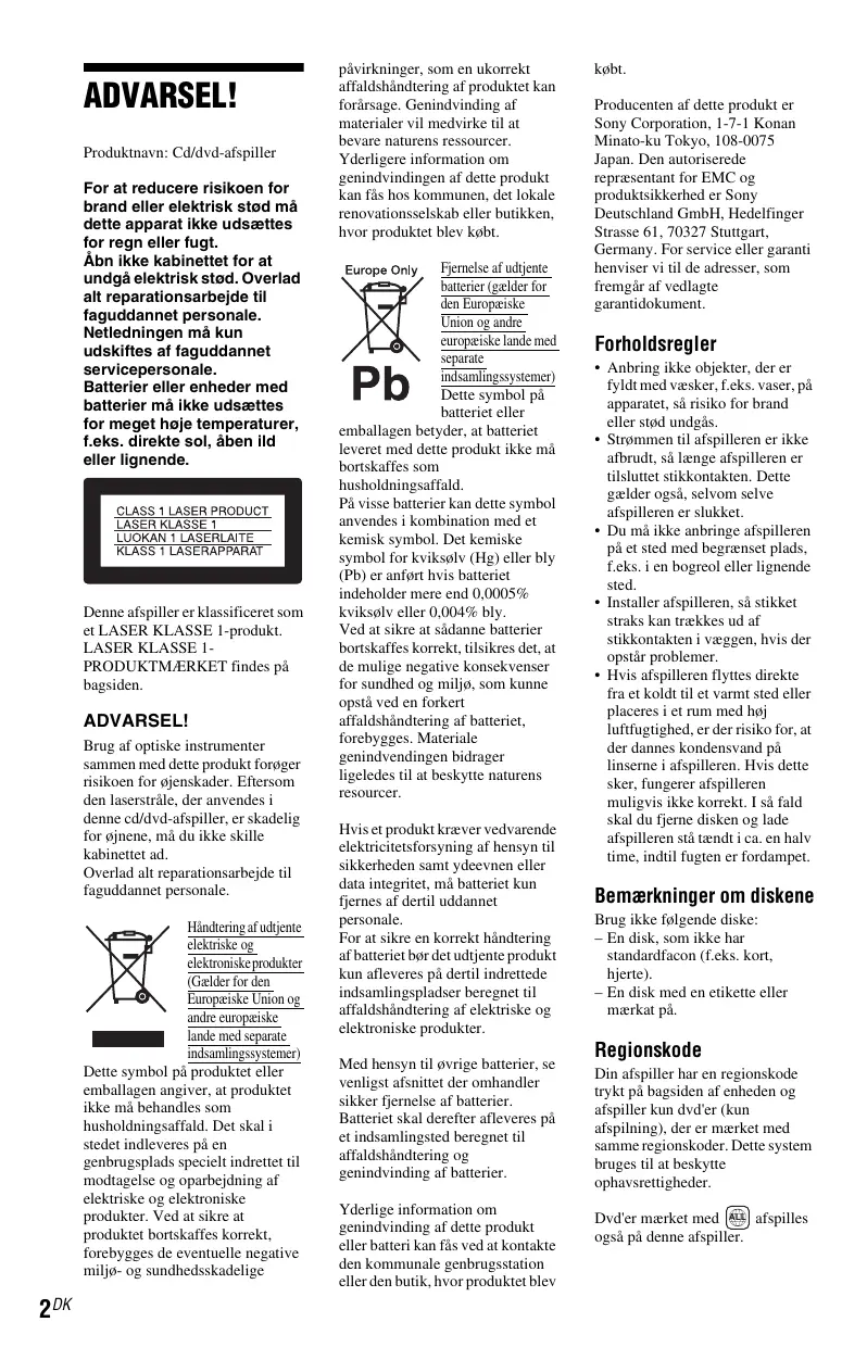 Para las demás baterías, consulte la sección donde se indica cómo extraer la batería del producto de forma segura. Deposite la batería en el correspondiente punto de recogida para el reciclado de baterías. Para recibir información detallada sobre el reciclaje de este producto o de la batería, póngase en contacto con el ayuntamiento, el punto de recogida más cercano o el establecimiento donde ha adquirido el producto. El fabricante de este producto es Sony Corporation, 1-7-1 Konan Minato-ku Tokyo, 108-0075 CA pueda ser desenchufado de la toma de corriente de la pared inmediatamente en caso de problema. • Si traslada el reproductor directamente de un lugar frío a uno cálido o si lo instala en una sala muy húmeda, es posible que se condense humedad en las lentes de su interior. Si esto ocurre, es posible que el reproductor no funcione correctamente. En este caso, extraiga el disco y deje encendido el reproductor durante
