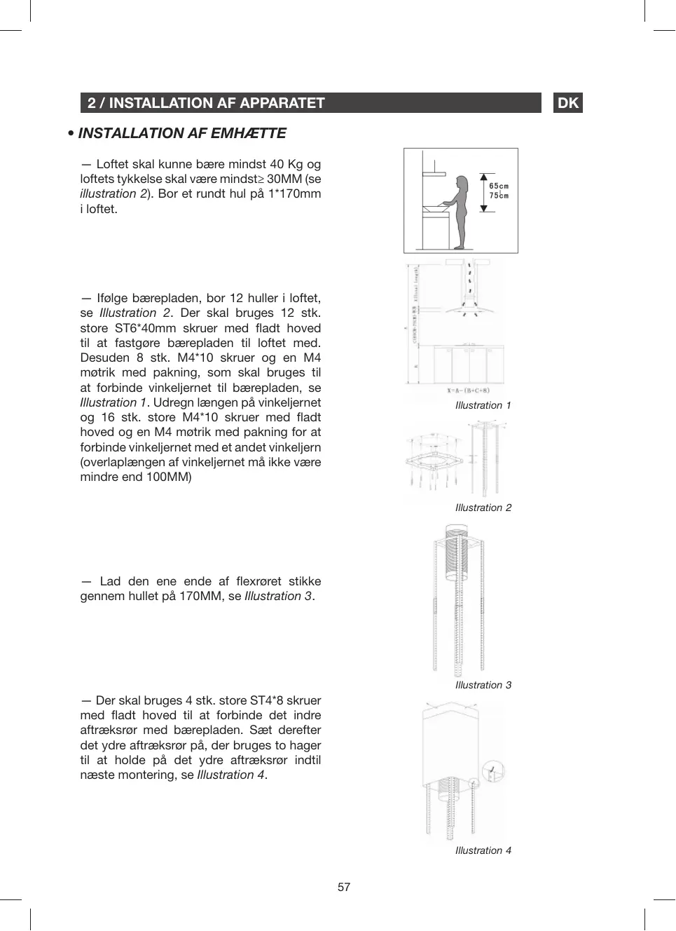 — Der skal bruges 4 stk. store ST4*8 skruer med fladt hoved til at forbinde det indre aftræksrør med bærepladen. Sæt derefter det ydre aftræksrør på, der bruges to hager til at holde på det ydre aftræksrør indtil næste montering, se Illustration 4.