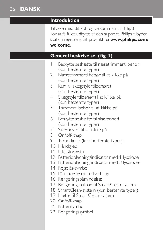 Beskyttelseshætte til næsetrimmertilbehør (kun bestemte typer) Næsetrimmertilbehør til at klikke på (kun bestemte typer) Kam til skægstylertilbehøret (kun bestemte typer) Skægstylertilbehør til at klikke på (kun bestemte typer) Trimmertilbehør til at klikke på (kun bestemte typer) Beskyttelseshætte til skærenhed (kun bestemte typer) Skærhoved til at klikke på On/off-knap Turbo-knap (kun bestemte typer) Håndgreb Lille strømstik Batteriopladningsindikator med 1 lysdiode Batteriopladningsindikator med 3 lysdioder Rejselås-symbol Påmindelse om udskiftning Rengøringspåmindelse: Rengøringspatron til SmartClean-system SmartClean-system (kun bestemte typer) Hætte til SmartClean-system On/off-knap Batterisymbol Rengøringssymbol