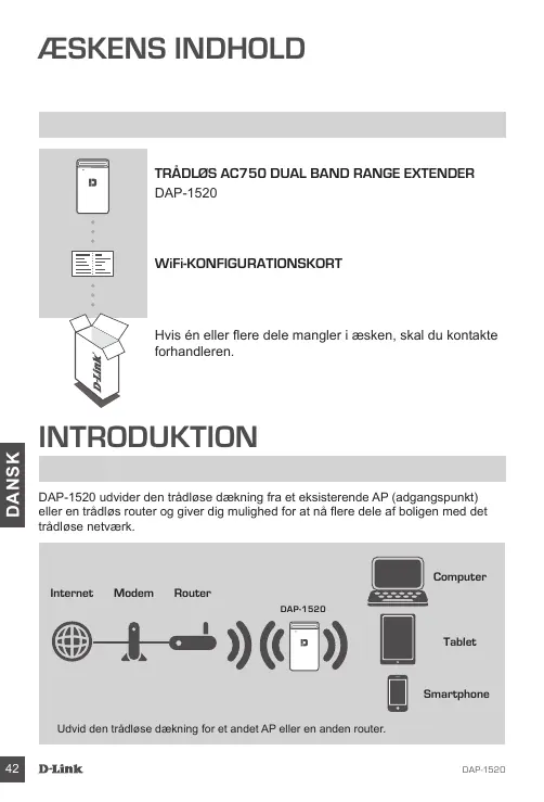 ÆSKENS INDHOLD TRÅDLØS AC750 DUAL BAND RANGE EXTENDER DAP-1520 WiFi-KONFIGURATIONSKORT DANSK Hvis én eller flere dele mangler i æsken, skal du kontakte forhandleren. INTRODUKTION DAP-1520 udvider den trådløse dækning fra et eksisterende AP (adgangspunkt) eller en trådløs router og giver dig mulighed for at nå flere dele af boligen med det trådløse netværk. Computer Internet Modem Router DAP-1520 Tablet Smartphone Udvid den trådløse dækning for et andet AP eller en anden router.