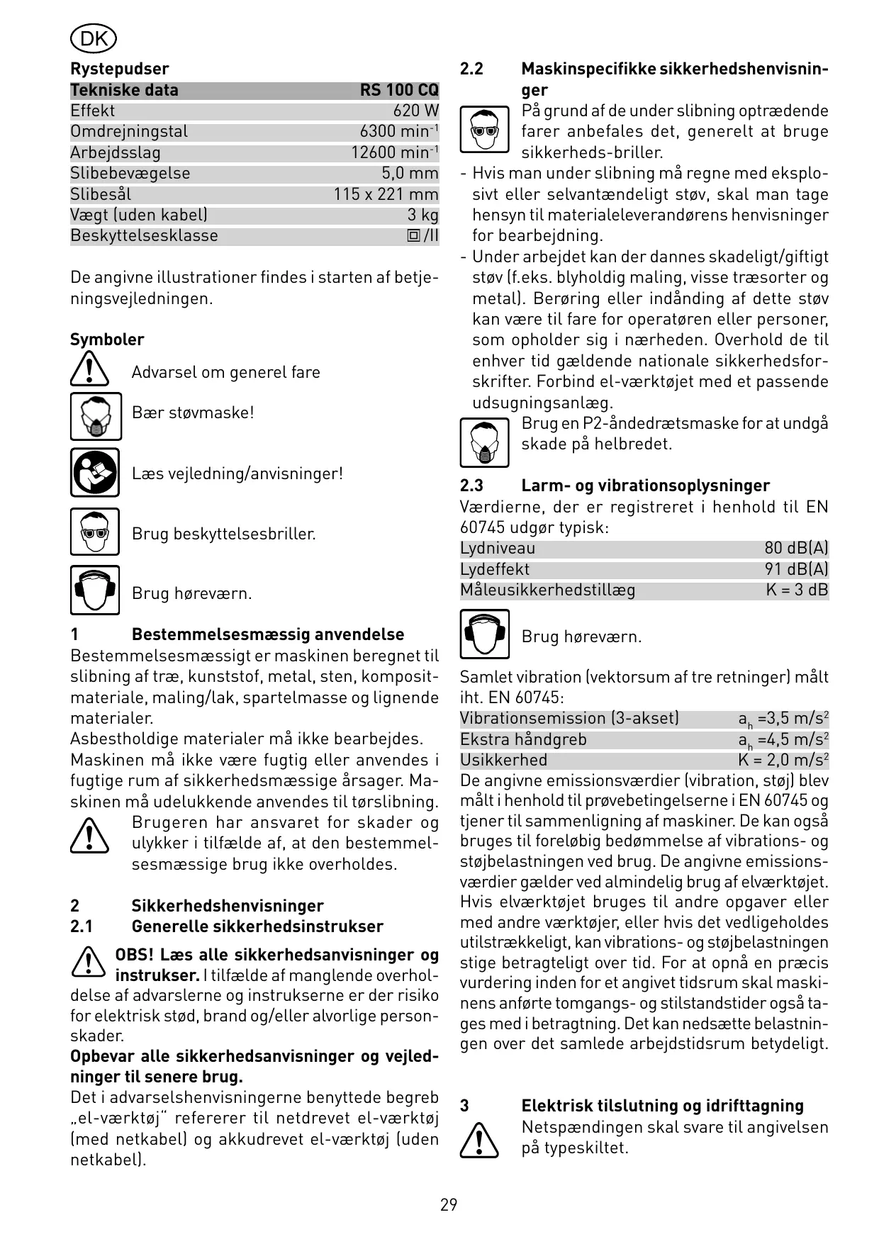 Symboles Avertissement de danger Portez des lunettes de protection ! Portez un masque antipoussières ! Lire la notice / les instructions ! Munissez-vous de casques anti-bruit!